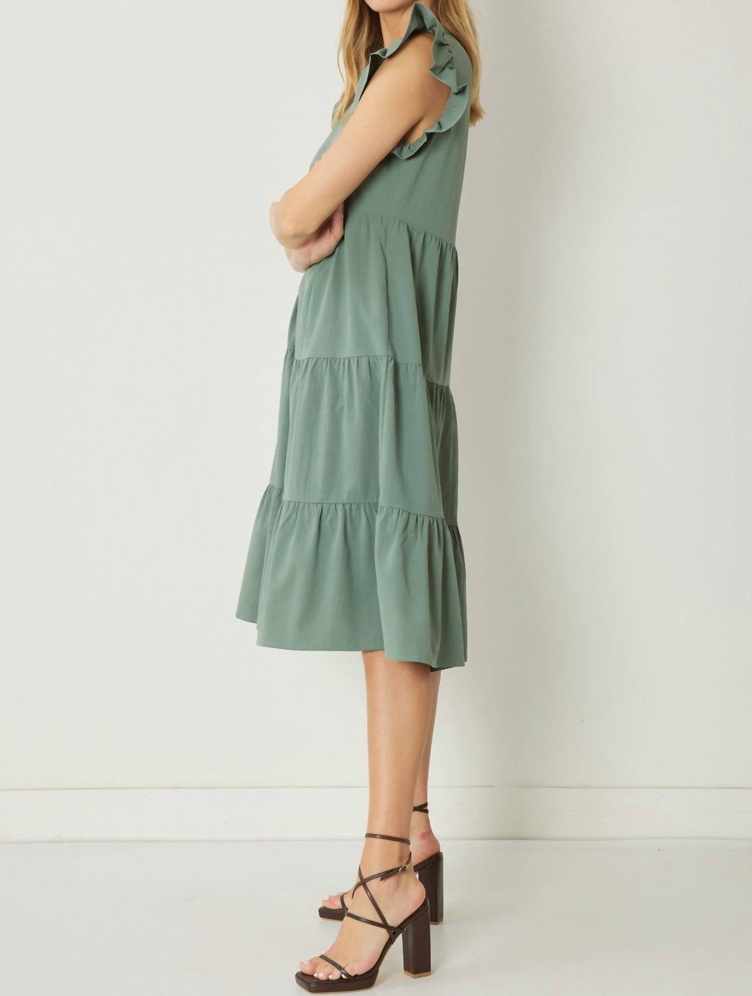 Apresentamos o Vestido Midi Mora em Camadas da Entro, um charmoso corte em A em tom alcachofra. Este vestido apresenta mangas curtas com babados amplos e um decote em V charmoso, oferecendo um estilo elegante e descontraído. Feito em 100% poliéster, oferece um toque leve e sem transparências, além de ser totalmente forrado com bolsos laterais funcionais. As instruções de cuidado não são especificadas, enquanto o fecho é um prático modelo pull-on, tornando este vestido uma opção fácil de usar para mulheres.