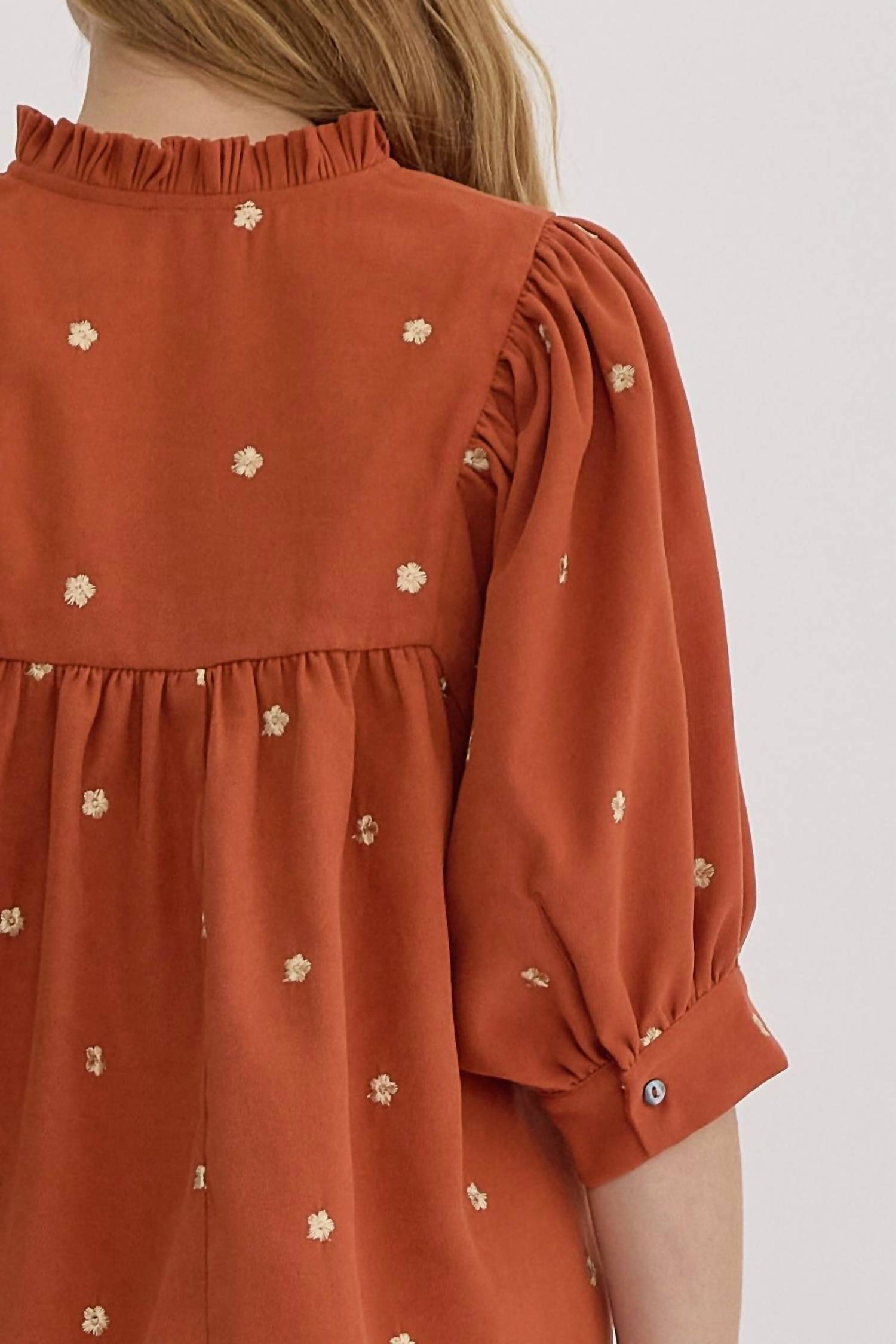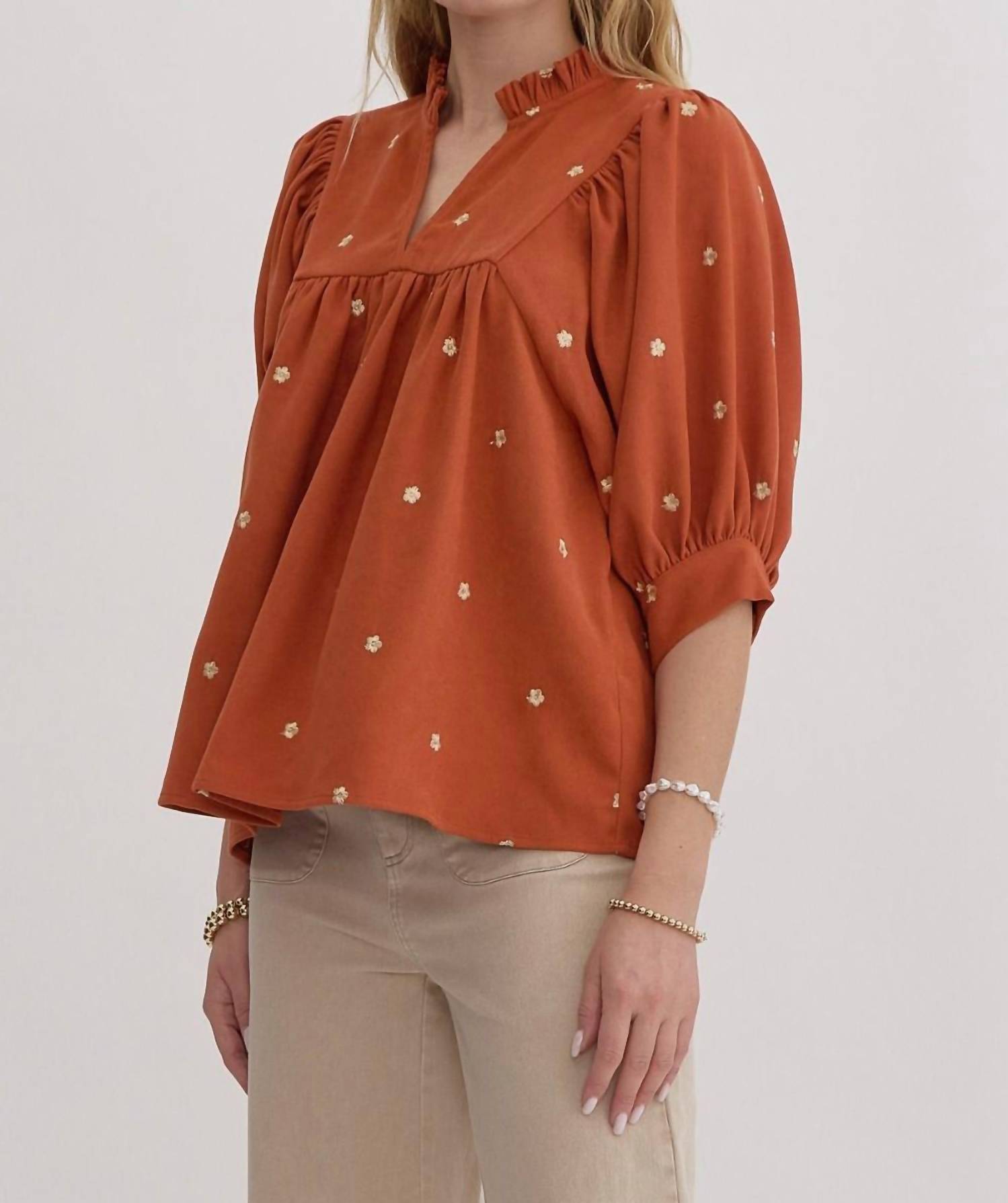 Combine isso com seus jeans e chinelos favoritos para sua próxima noite entre amigas. Apresentamos o Mums The Word Top da Entro, uma blusa em tom ferrugem vibrante adornada com bordados florais dourados para um toque elegante. Este top feminino apresenta mangas até o cotovelo e um charmoso decote com babados. Com composição de 97% poliéster e 3% elastano, oferece um caimento leve e confortável. Fecho: Puxe para vestir, ideal para um estilo despojado. Observação: Este top tem modelagem grande.