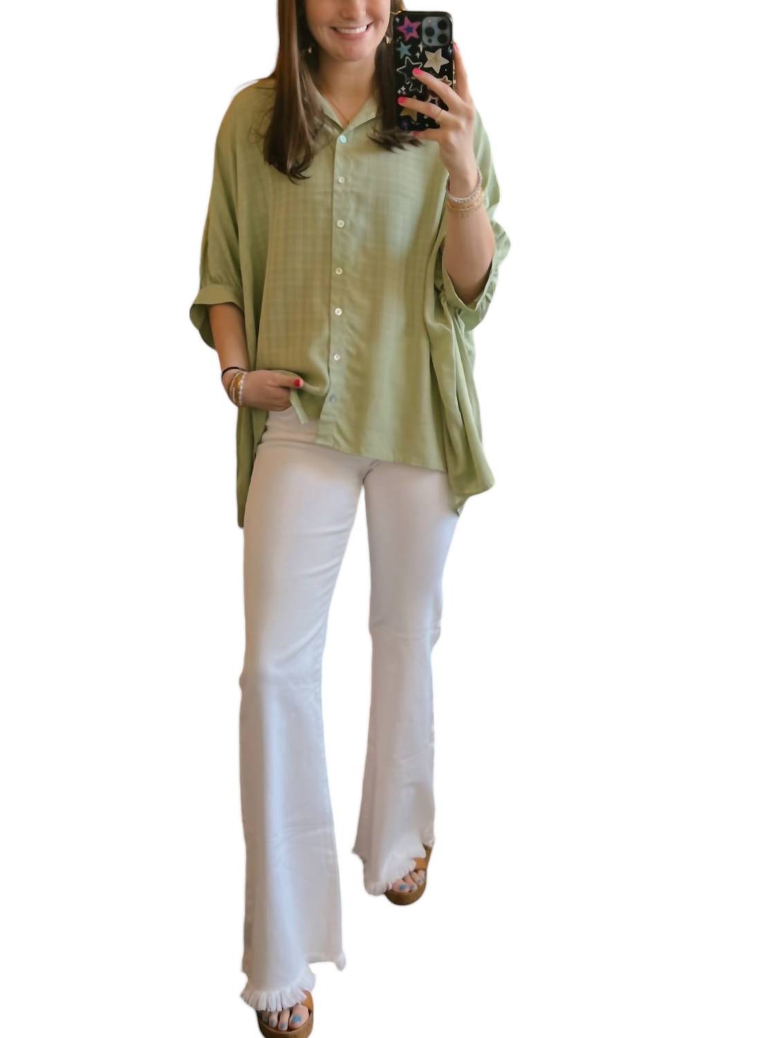 Uma camisa clássica de botões que nunca sai de moda. Esta blusa de botões com estampa monocromática apresenta gola alta, fecho frontal com botões e mangas dolman para um caimento relaxado. Confeccionada em 65% rayon e 35% poliéster, oferece conforto e estilo. Instruções de cuidado: Lavar à mão com água fria, não usar alvejante e secar no varal.
