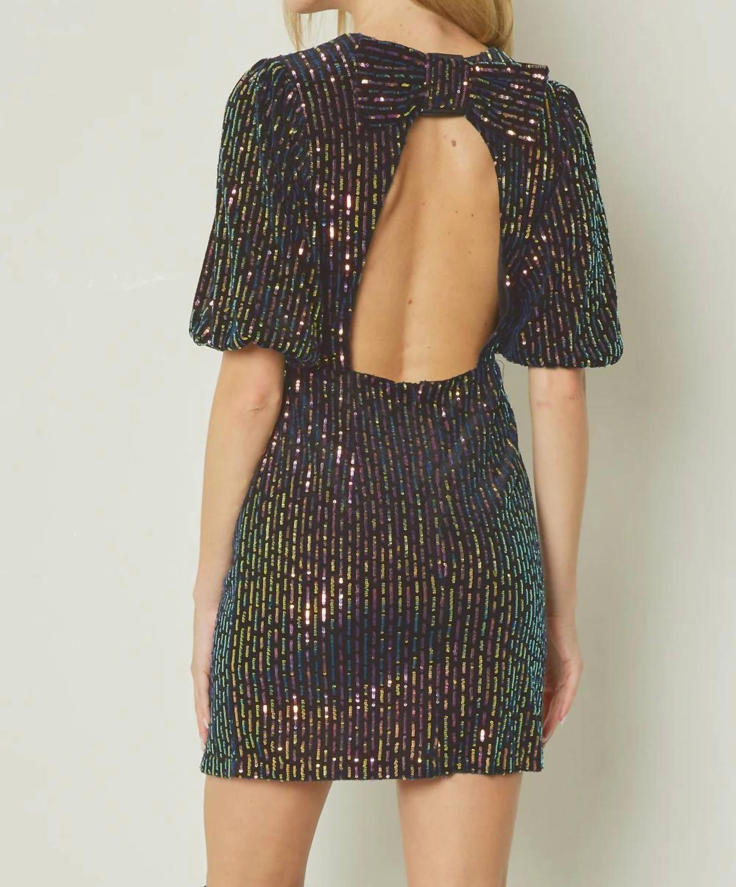 A short and breezy dress for those warmer days. Step into the spotlight with the Sequin Bubble Dress by Entro, an exquisite choice for evening events. This stunning mini dress in classic black features short bubble sleeves and an open back for a bold statement. Crafted from 100% polyester, it offers a textured, medium-weight feel with a zip closure and a bow at the neck for easy styling. Care for this glamorous piece with gentle hand washing to maintain its glittery allure.