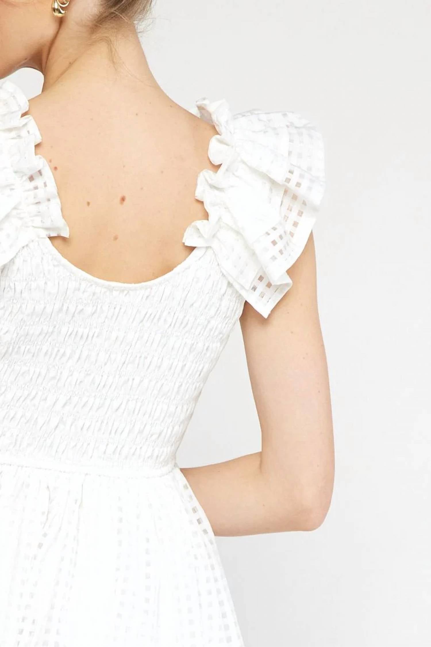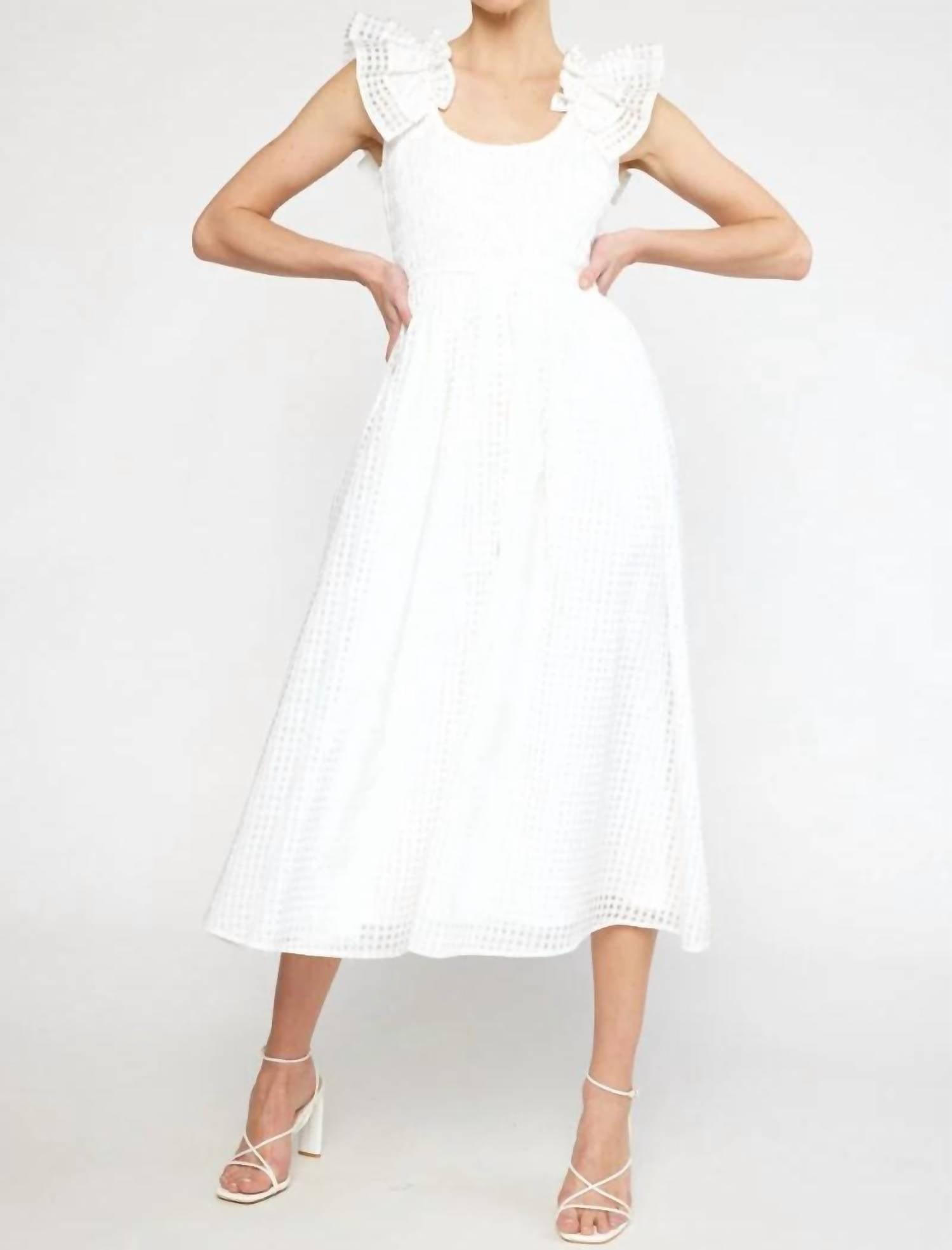 The perfect length dress does exist. Embrace elegance with the Shadow Grid Midi Dress by Entro, designed for a chic and minimalist summer look. This white fit and flare dress features cap sleeves and a unique shadow grid pattern that adds texture to its scoop neck design. Crafted from lightweight woven material, it offers comfort with a pull-on closure and is ideal for vacation wear. Care: Hand wash and line dry.