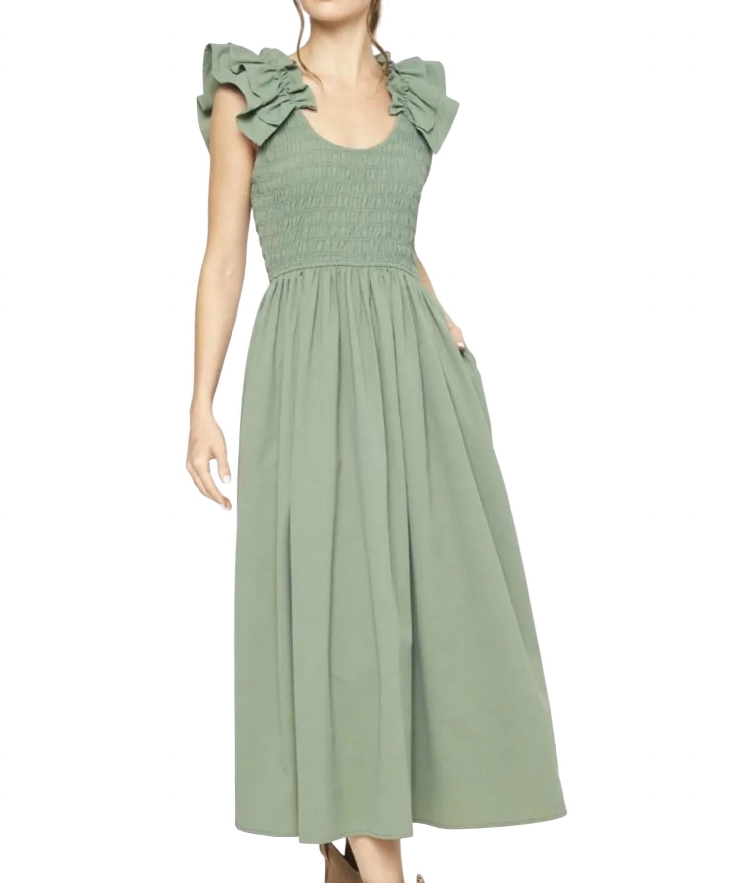 The perfect length dress does exist. The Smocked Midi Dress by Entro is your go-to for a chic vacation look, crafted in a minimalist A-line silhouette with sleeveless scoopneck design. Made from high-quality materials, this sage-hued dress features smocked details and shoulder ruffles for a touch of femininity. With convenient side pockets and a comfortable midi length, it's as practical as it is stylish. Care: Hand wash and line dry.