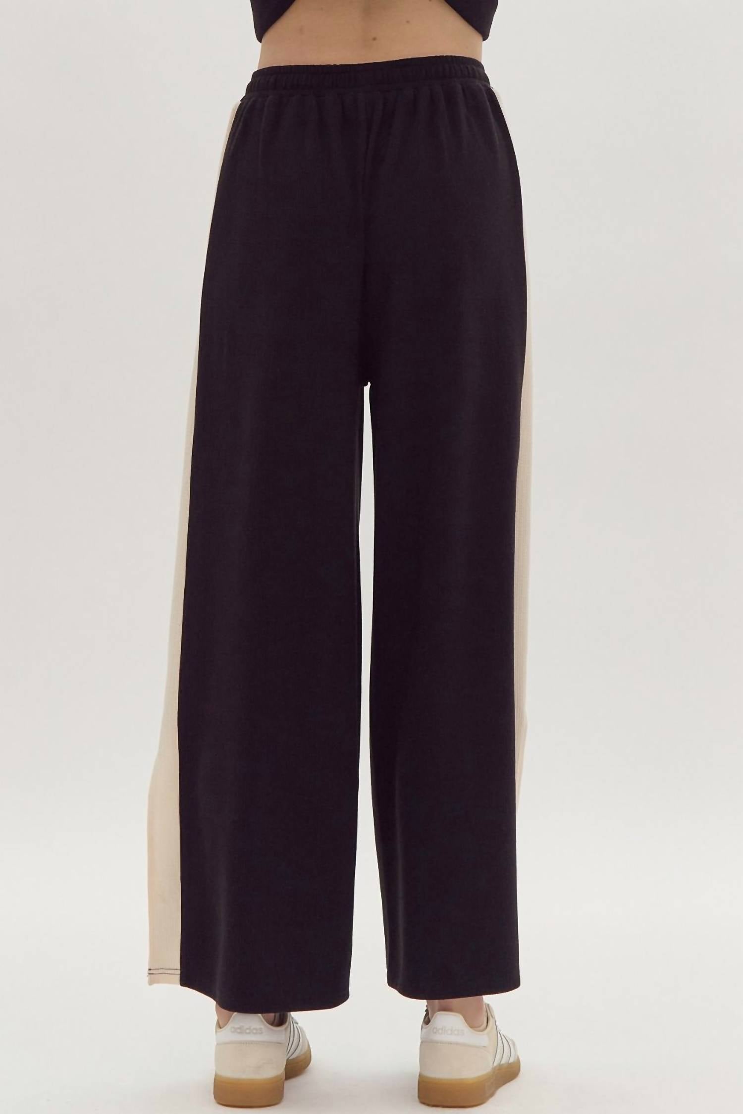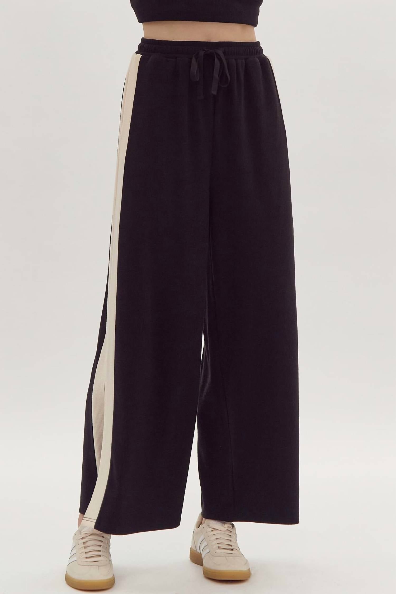 Uma combinação perfeita. Este conjunto de duas peças é tão fofo que você vai desejar poder usá-lo fora de casa! Já mencionamos o quão confortável ele é? Você pode querer dois conjuntos! Este conjunto inclui calças largas de cintura alta com nervuras lisas, fendas laterais, cós elástico, cinto com amarração e bolsos laterais. A blusa combinando tem gola canoa com nervuras lisas e mangas curtas. Ambas as peças não têm forro e são feitas de 95% poliéster e 5% elastano. Lavar à mão com água fria.