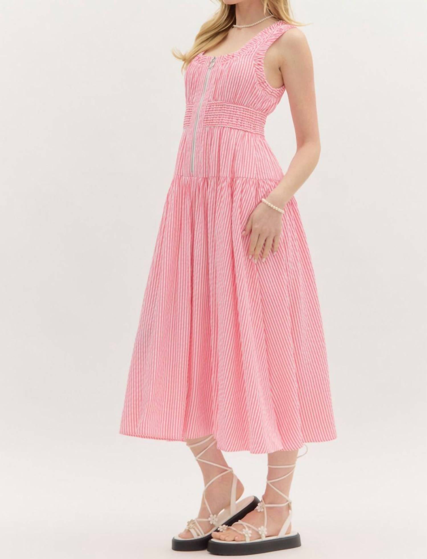 Just add slides or mules and you are good to go. Introducing the Striped Zipper Dress by Entro, a vibrant choice for summer occasions. This sleeveless midi dress features a contemporary red and white stripe pattern and a flattering smocked waist. With functional front zip closure and practical pockets, this A-line dress combines style and utility. The dress is bra-friendly with wide straps and is lined for added comfort, fitting true to size for sizes small to large.