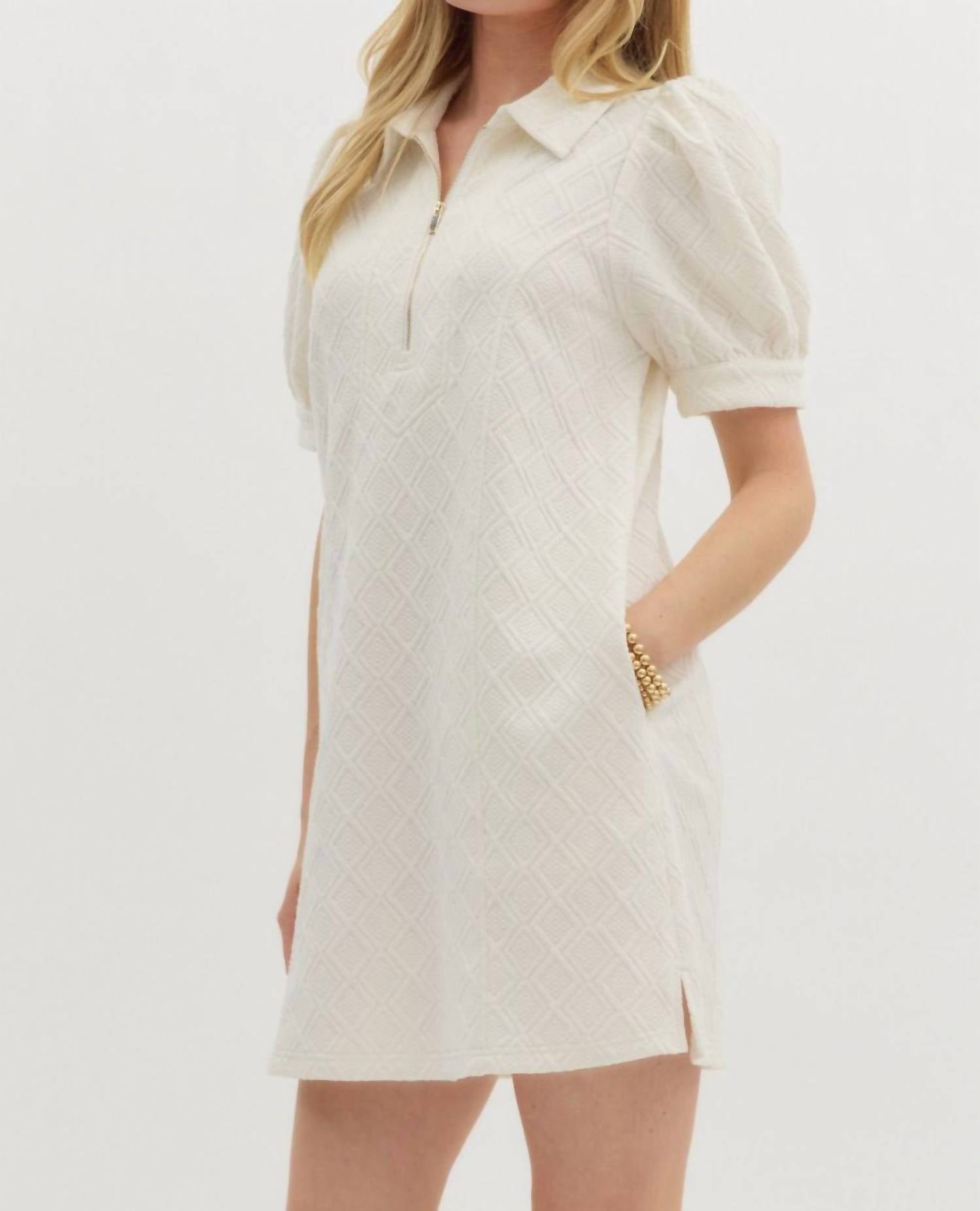 Elevate your summer wardrobe with the Cream Textured Puff Sleeve Mini Dress by Entro. This geometric-patterned shift dress features short puff sleeves and a chic collar with a convenient front zip closure. Made from polyester, this lightweight, non-sheer dress is perfect for minimalist vacation styling. Care is easy with machine washing.