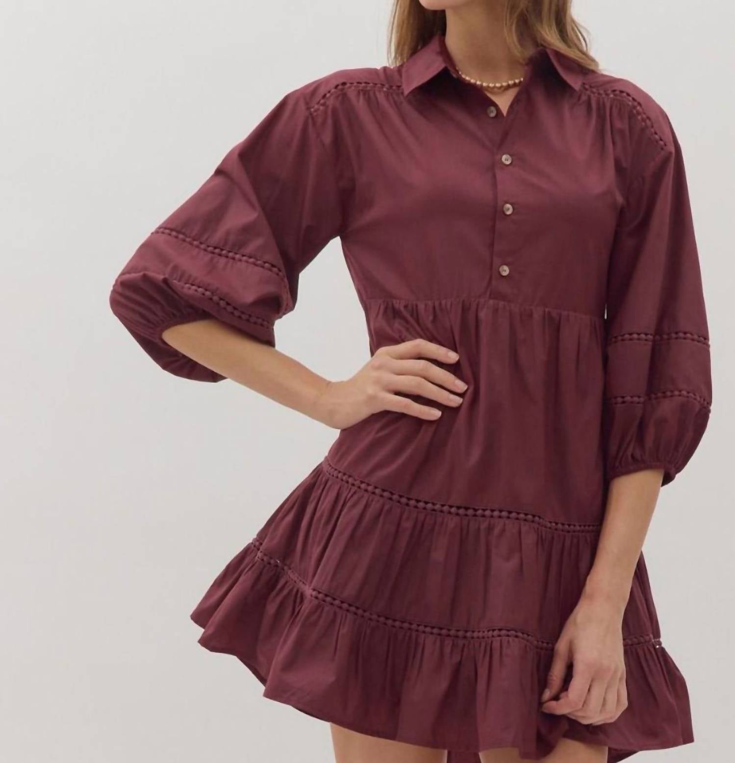 A short and breezy dress for those warmer days. Introducing the Entro Tiered Mini Dress with Lace Trim, a chic addition to your summer wardrobe in a rich wine hue. This mini dress features three-quarter sleeves and delicate lace inset trim, offering an elegant twist to the classic solid pattern. Crafted with a collared neckline and an A-line silhouette, it includes a functional button closure at the front and convenient side pockets. Designed for lightweight comfort, it’s perfect for your next Valentine’s Day outing. Care: Dry clean only.