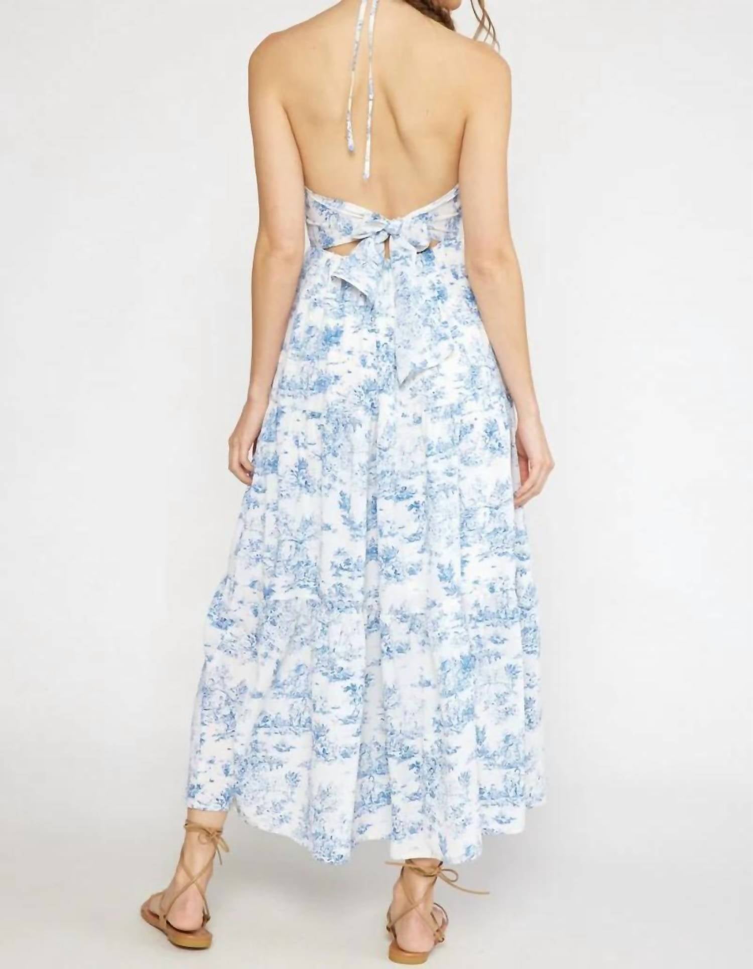 Introducing the Blue/White Toile Print Tie Back Midi Dress by Entro, a stunning piece for your summer vacation wardrobe. This sleeveless maxi dress features a boho chic halter neckline with a tie closure, offering a fit and flare silhouette highlighted by its beautiful antique print. Crafted from 100% polyester, the dress is lined for comfort and includes convenient side pockets. Simply machine wash to maintain its lightweight, non-sheer woven fabric, and enjoy its effortlessly elegant style. Garment length: 50 inches.
