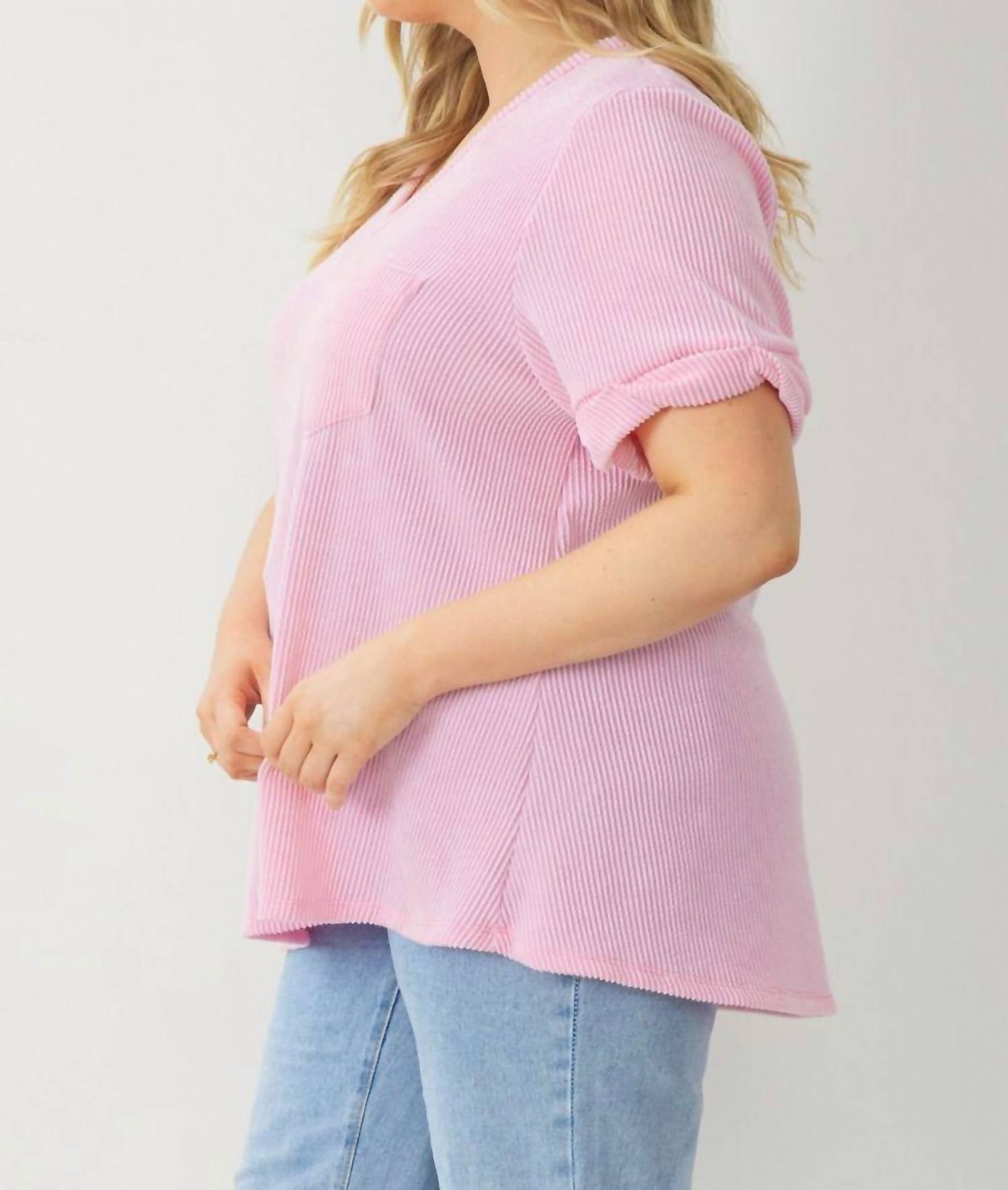 Não procure mais, você acabou de encontrar a camiseta perfeita! Esta camiseta com caimento relaxado é tão confortável que você vai querer usá-la o ano todo. A cor rosa suave é perfeita para a transição para a primavera. A camiseta tem decote em V e mangas curtas, punhos enrolados e bolso no busto. A camiseta não tem forro, é transparente e leve. Pegue seu short ou jeans e você está pronta para arrasar. 76% poliéster, 21% rayon, 3% elastano. A modelo tem 1,75 m e veste tamanho extra grande.
