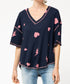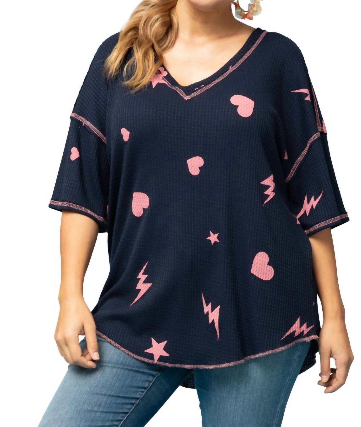 It features dropped shoulders, short/elbow sleeves, a V-neck, a scoop hemline, a lightweight waffle knit fabric, and a navy background with pink hearts, stars, and lightning bolts. Small bust 42", length 27". Medium bust 44", length 27". Large bust 46", length 27". XL bust 48", length 30". 1X bust 50", length 30". 2X bust 52", length 30". 63% polyester, 33% rayon, 4% spandex. Soft and stretchy fabric. Hand wash or dry clean. Made in the USA.