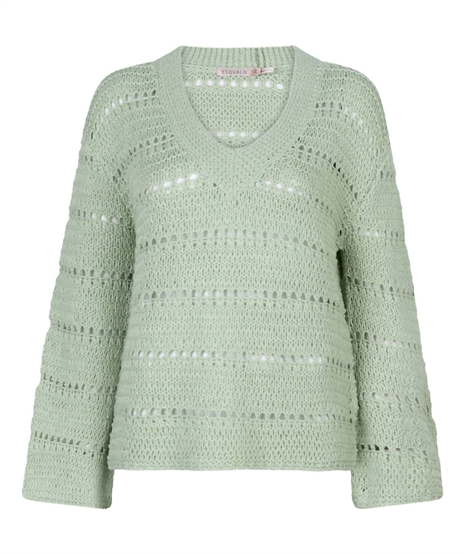 Descubra o charme aconchegante do suéter de crochê com decote em V da ESQUALO, lindamente confeccionado em um refrescante tom pistache. Este suéter possui mangas longas com um leve formato de sino, adicionando um toque de elegância ao seu decote em V. Feito em 100% acrílico, oferece um padrão texturizado perfeito para sobreposições. Aproveite a praticidade do fecho pull-on para um ajuste perfeito e elegante.