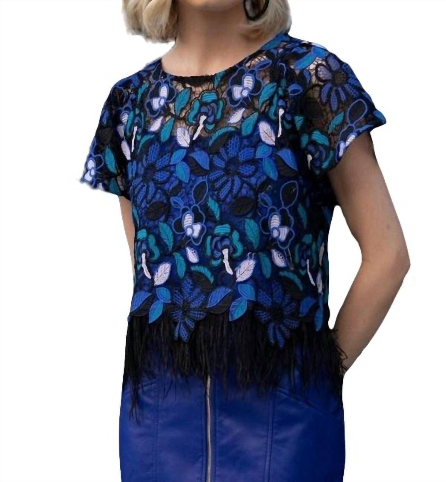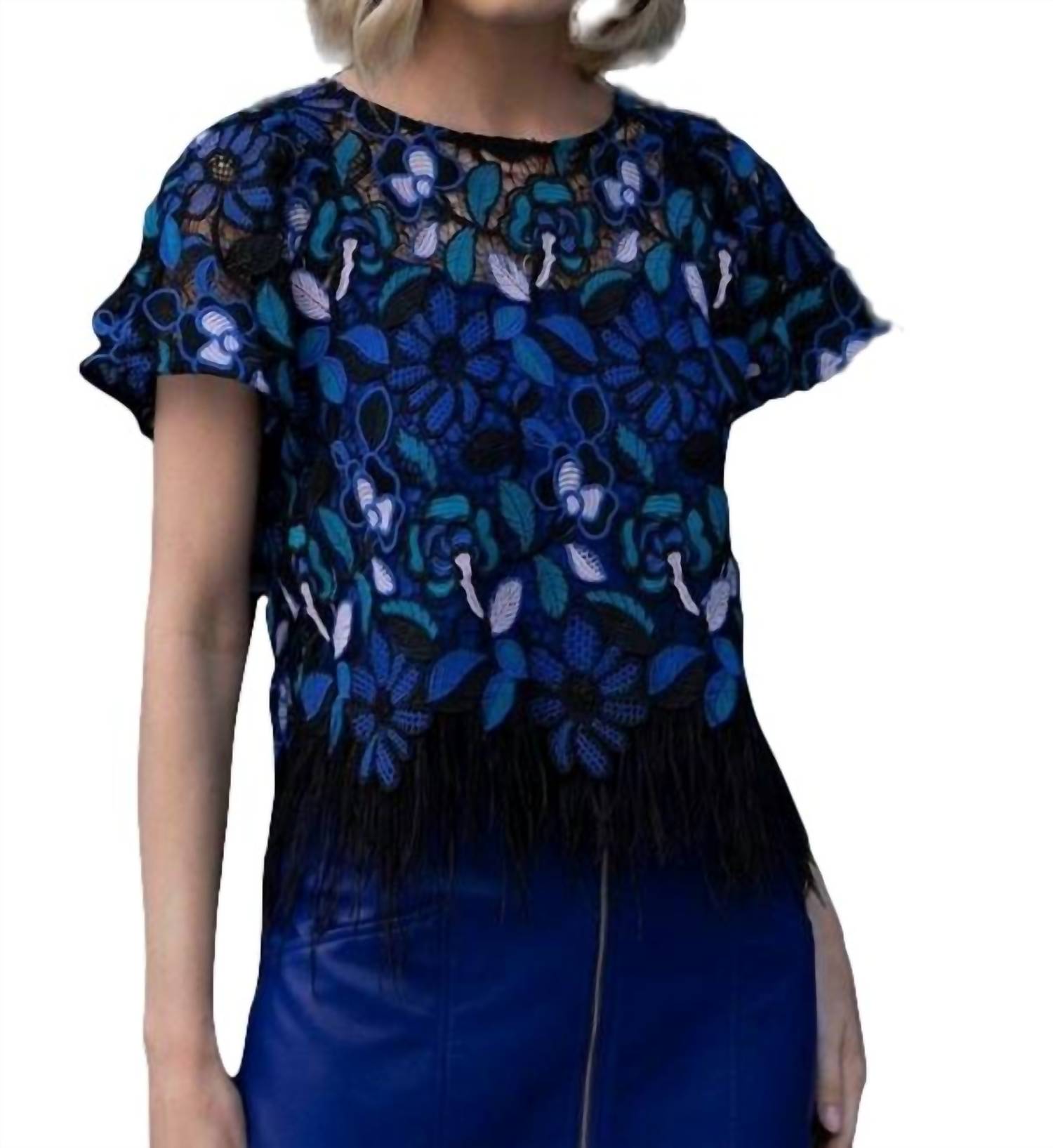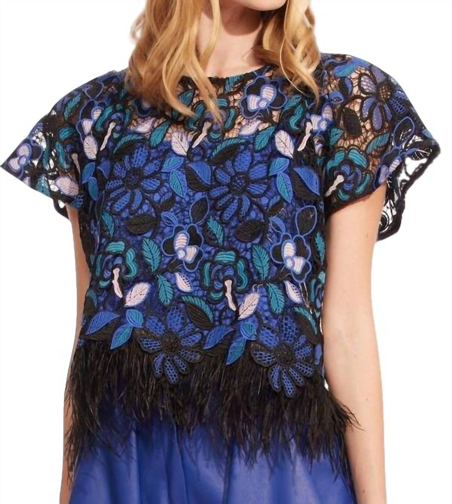 Este lindo top de renda com manga curta e acabamento em penas pretas torna o estilo confortável e chique realmente fácil. Acabamento em penas. Manga curta. Gola redonda. Estilo pulôver.