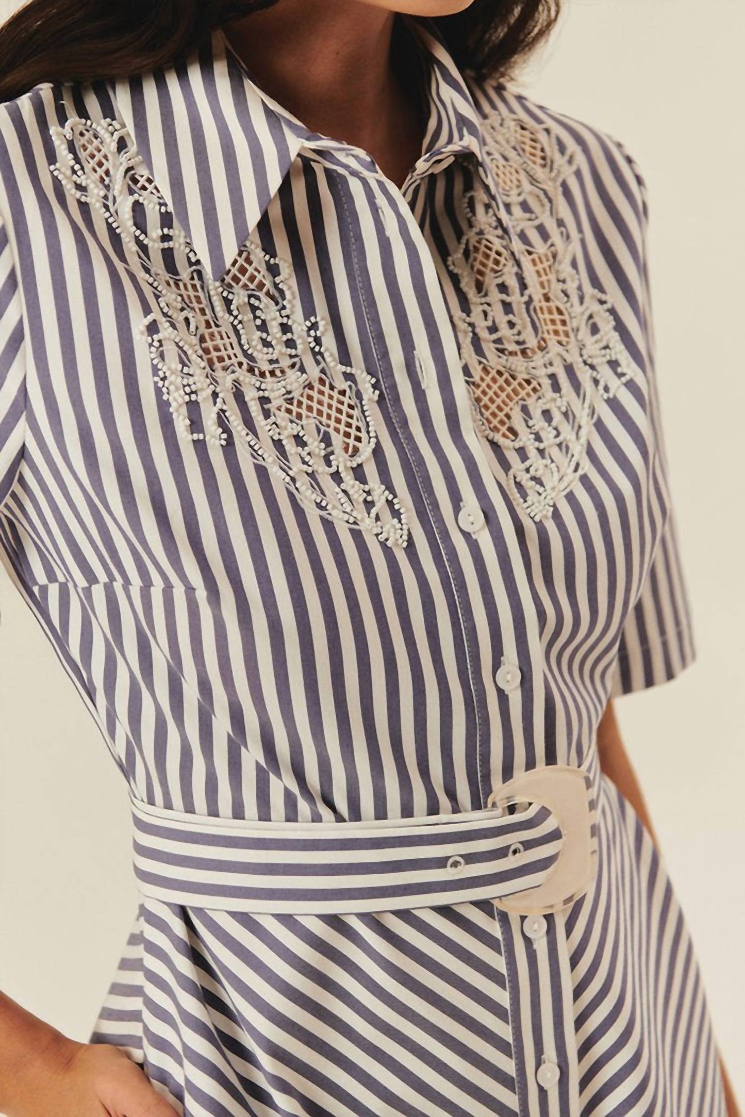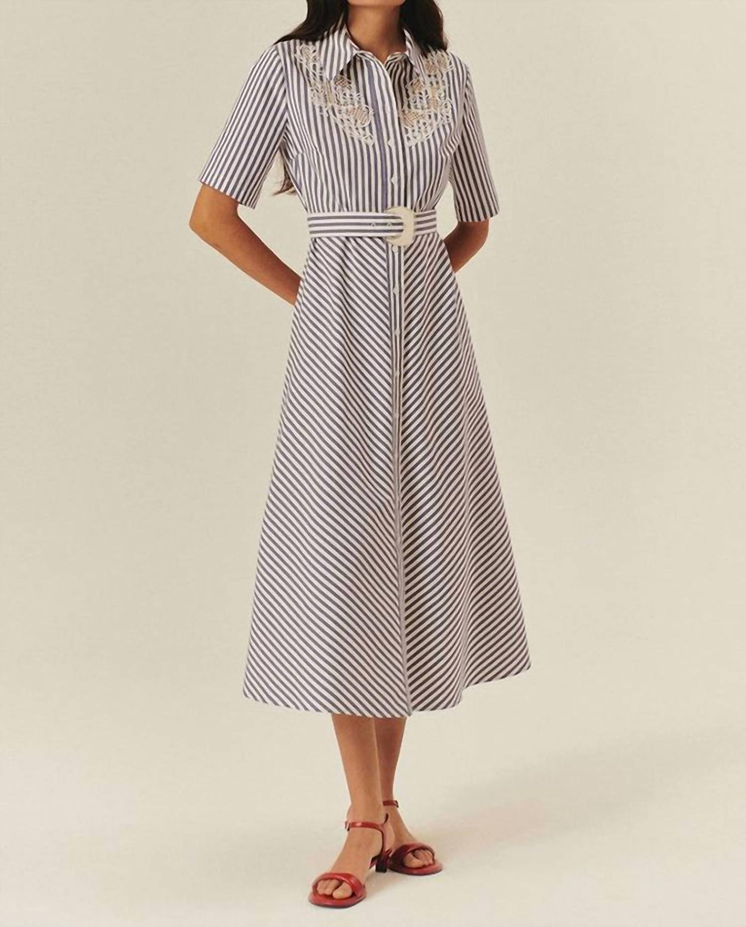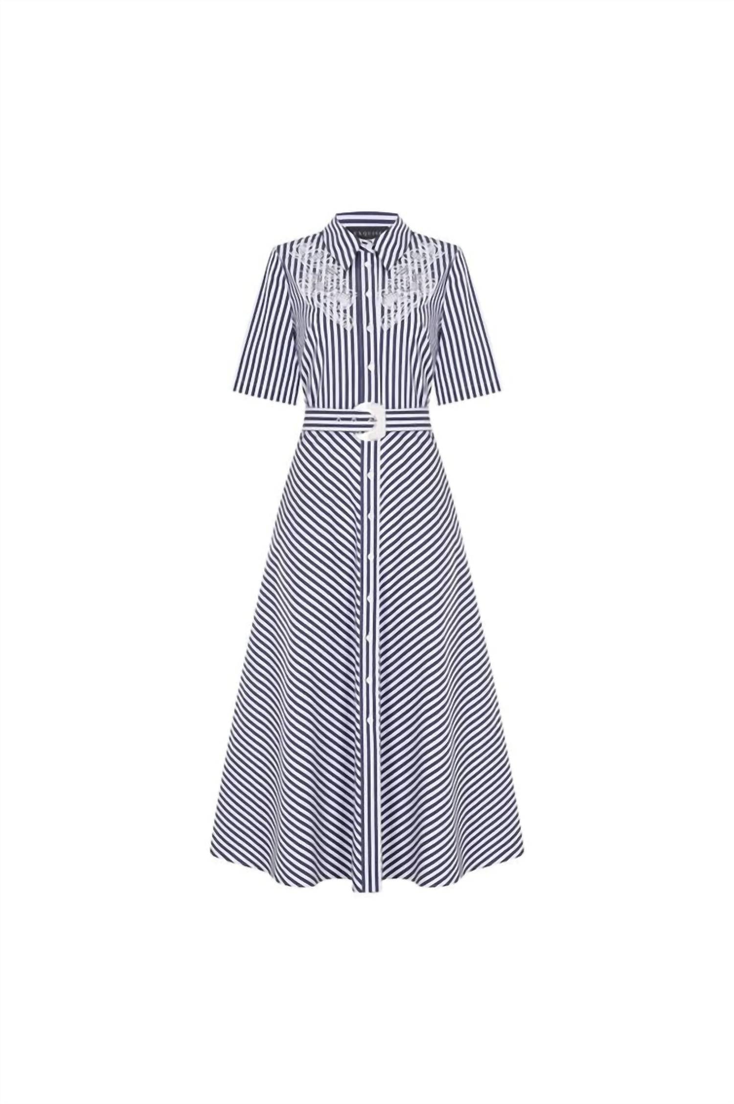 Embrace timeless sophistication with the Arielle Midi Dress by EXQUISE, a spring vacation essential. This women’s A-line dress features a chic collar and short sleeves in a stylish navy cream stripe, perfect for workwear trends. Crafted from a cotton blend of 67% Cotton, 31% Polyester, and 2% Elastane, it offers comfort and style. Closure: Button closure. Care: Dry clean only.