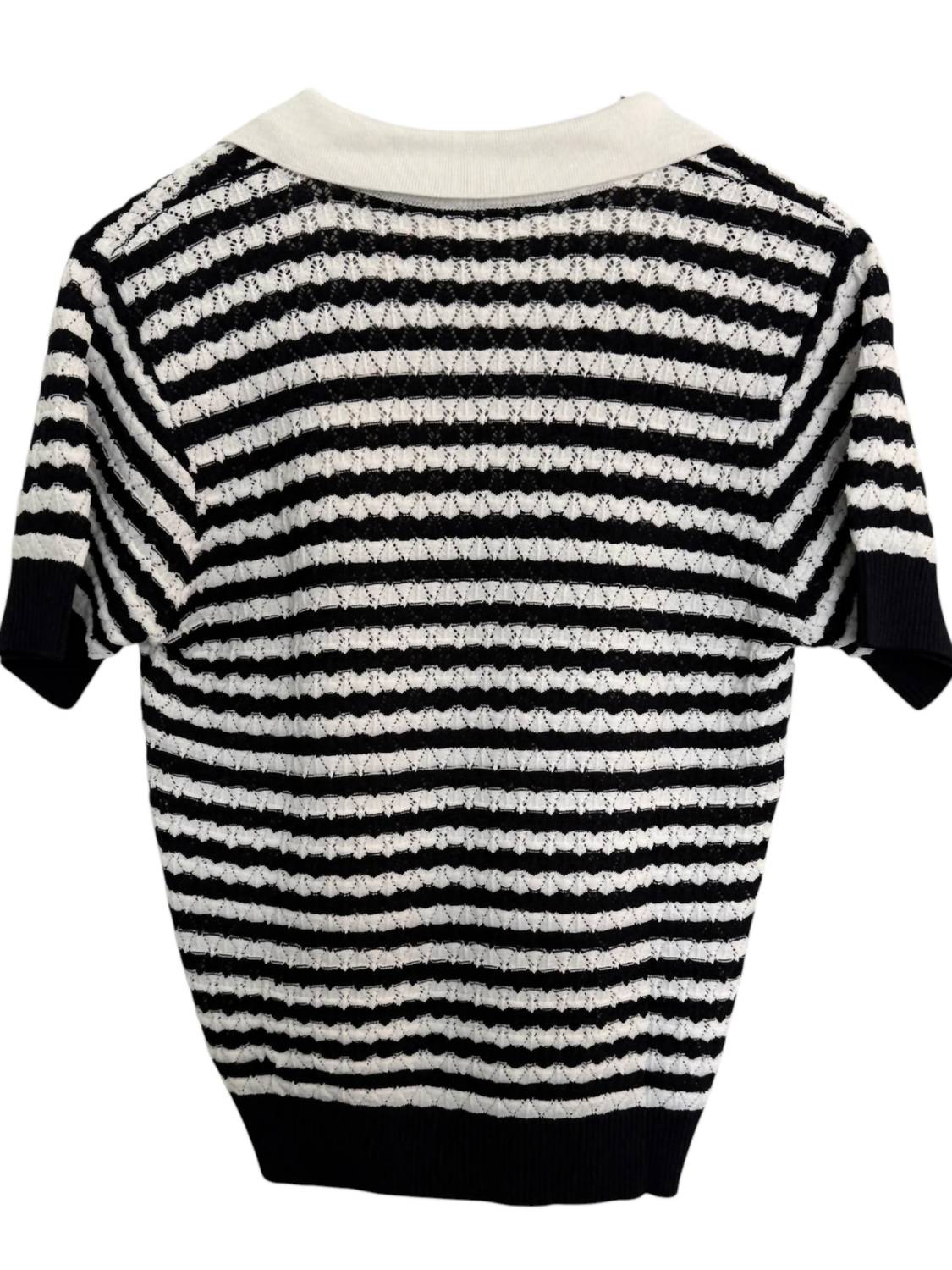 Introducing the Women's Virginia Top by EXQUISE, a chic navy and white striped piece perfect for any holiday party. This preppy short sleeve tee features a flattering V-neck design, ideal for the spring season and festive Thanksgiving occasions. Made with convenience in mind, it has a simple pull-on closure.