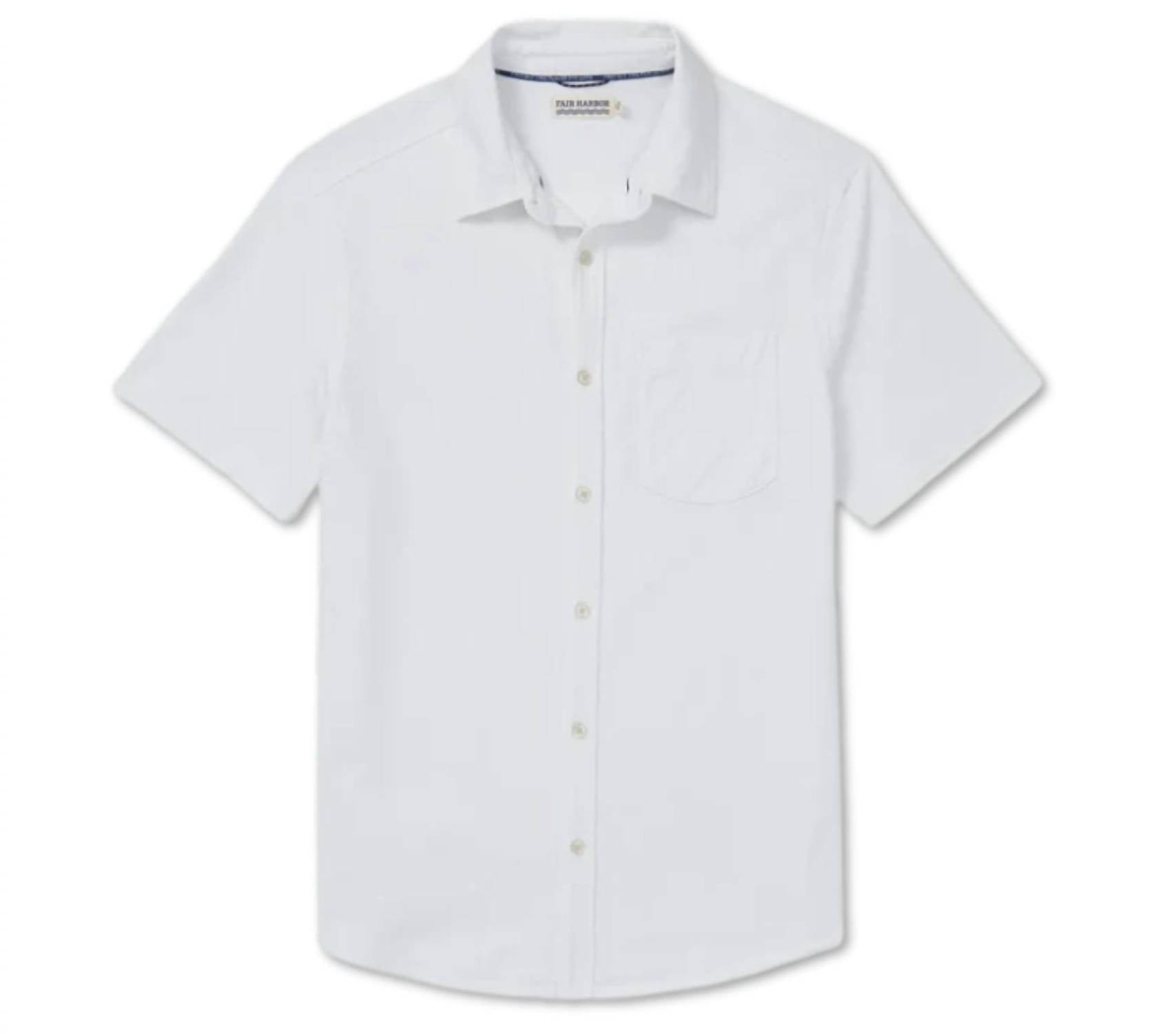 Meet the Saltaire Button Down Shirt by FAIR HARBOR, a solid white masterpiece perfect for any occasion. This shirt is crafted from 100% organic cotton with short sleeves and features a structured collar, enhanced by a button front placket. The garment-dyed finish ensures a unique wash, adding a touch of casual elegance to your ensemble. Care is simple with machine wash and line dry instructions, making it an ideal choice for summer and workwear alike.