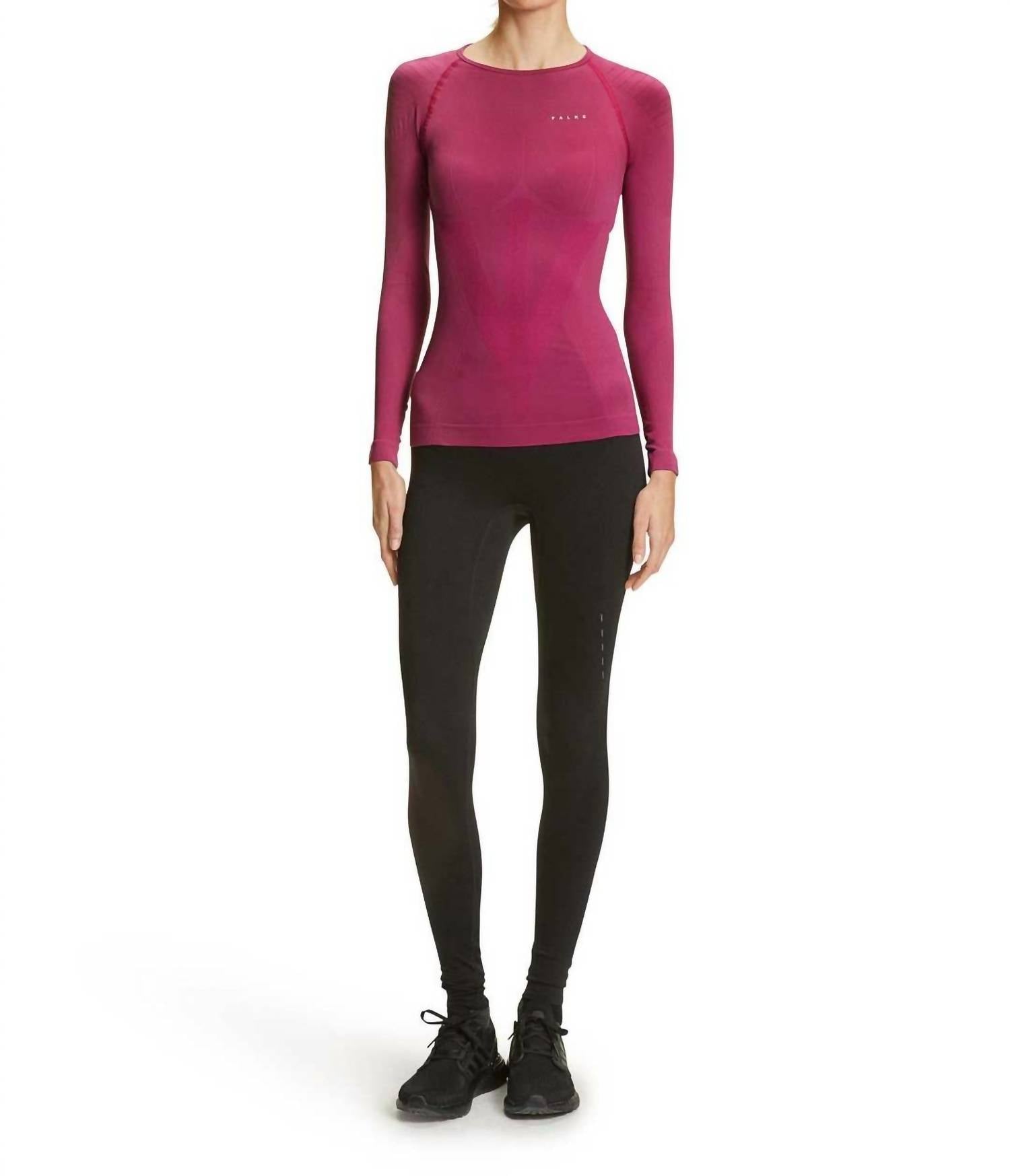 Stay comfortable and stylish during your workouts with the Falke Long Sleeve Base Layer Top in Radiant Orchid. Designed with long sleeves and crafted from 69% Polyamide, 26% Polyester, and 5% Elastane, this top offers a close body fit that ensures maximum freedom of movement with flex zones at the shoulders and elbows. This pull-on garment boasts a solid pattern with a crewneck, making it perfect for athleisure and fitness activities. Care for it with machine washing and lay it flat to dry to maintain its high-quality structure.