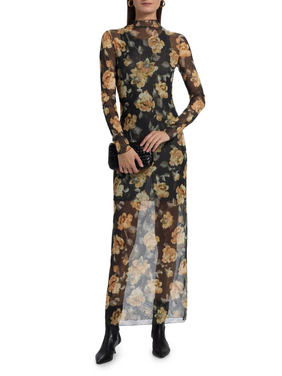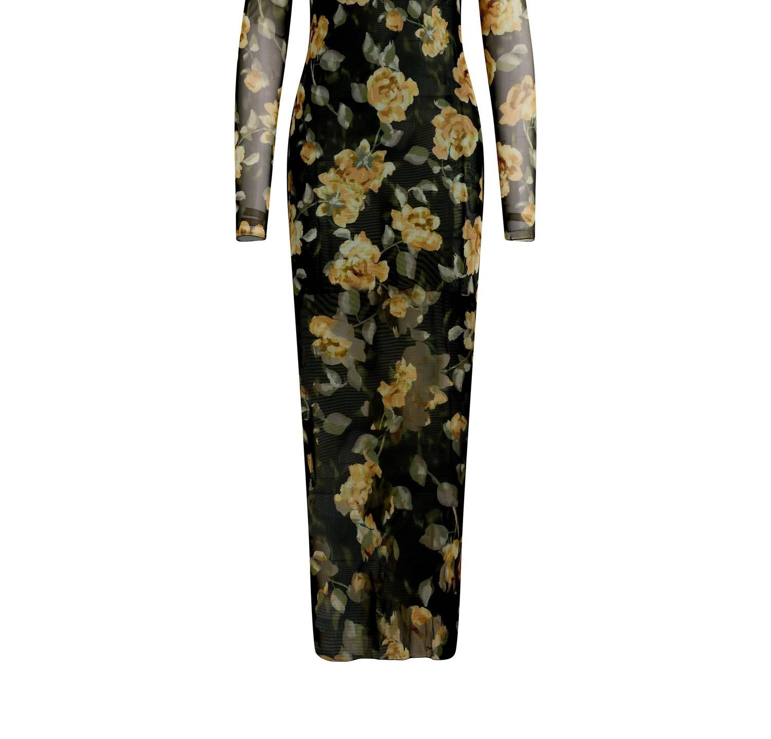 Discover the Sheer Fantasy Dress by Favorite Daughter, a maxi-length marvel in a captivating Golden Flowerbed floral design. This sophisticated piece features long sleeves and a mockneck, creating a refined silhouette that flatters with its sheath design. Crafted from a delicate knit mesh composed of 85% polyester and 15% elastane, it exudes both elegance and comfort. Perfect for vacation outings, this dress embodies the Boho Chic trend and is ideal for spring occasions.