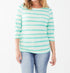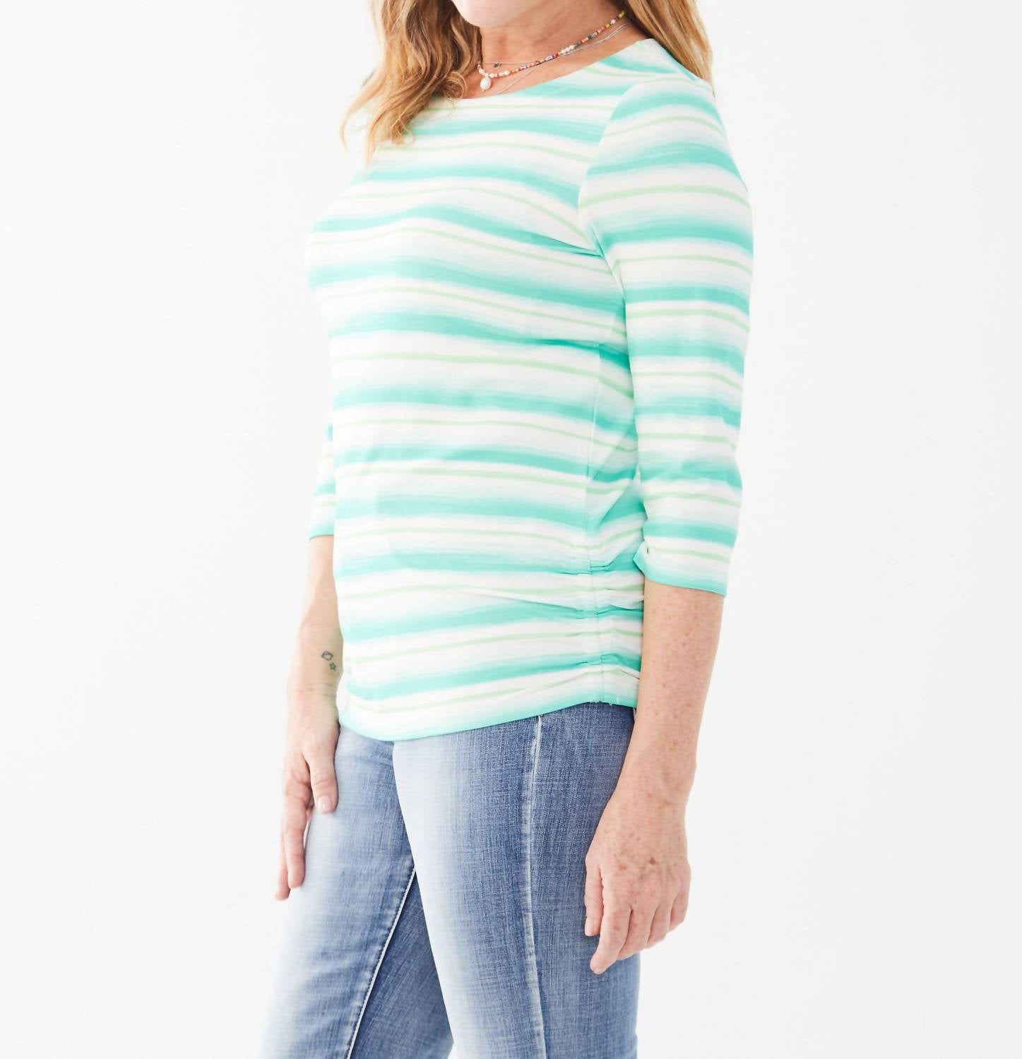 3/4 sleeve stripe boatneck top with rusched sides. Fabric: 95% Viscose, 5% Elastane.