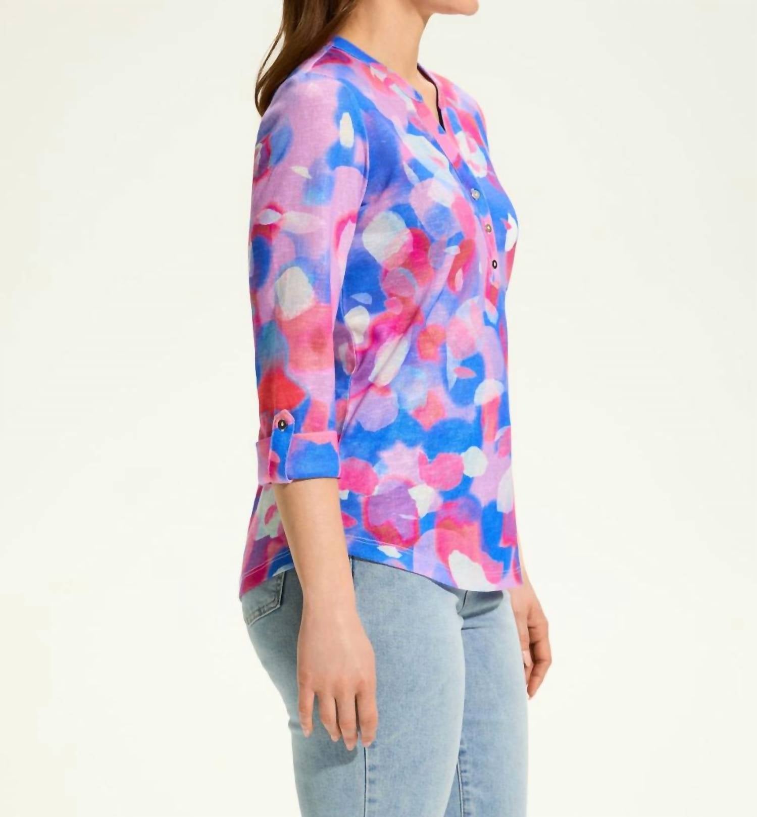 The Bright Lights Top by FDJ is a vibrant vacation essential, featuring a captivating multicolor tie-dye pattern. Designed with a three-quarter sleeve and a flattering V-neckline, it offers a straight fit that stays true to size. Composition: Polyester with a stretchy, preshrunk fabric, ensuring all-day comfort. Closure: Button closure. Crafted with no need for special care.