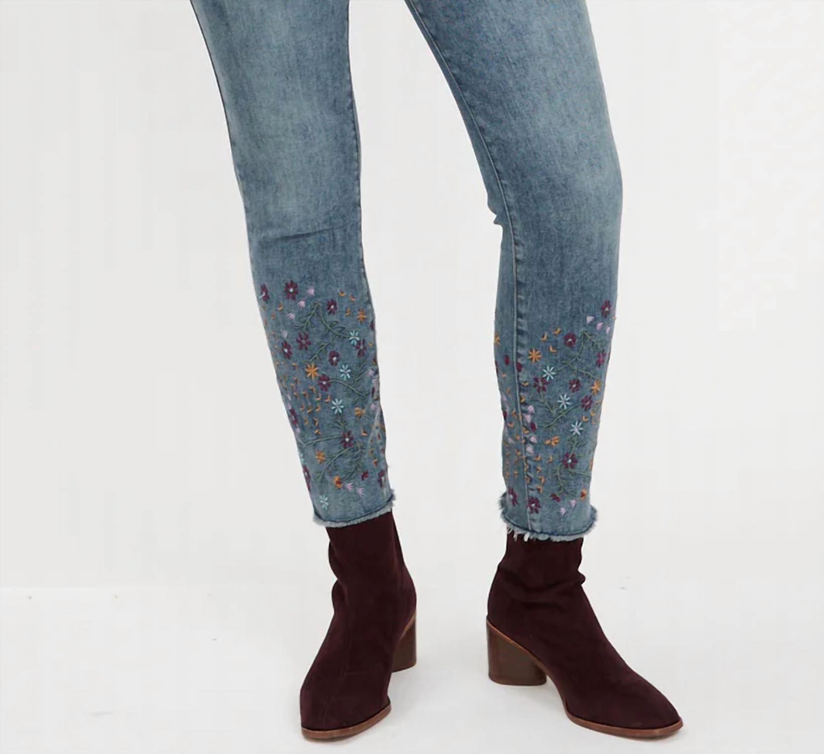 Elevate your wardrobe with the Olivia Slim Ankle Jeans by FDJ in Medium Blue, featuring a charming dainty floral embroidery near the hemline. Crafted in a straight leg design, these jeans boast a zip closure and a flattering slim fit, complete with convenient 5-pocket styling. Machine wash.