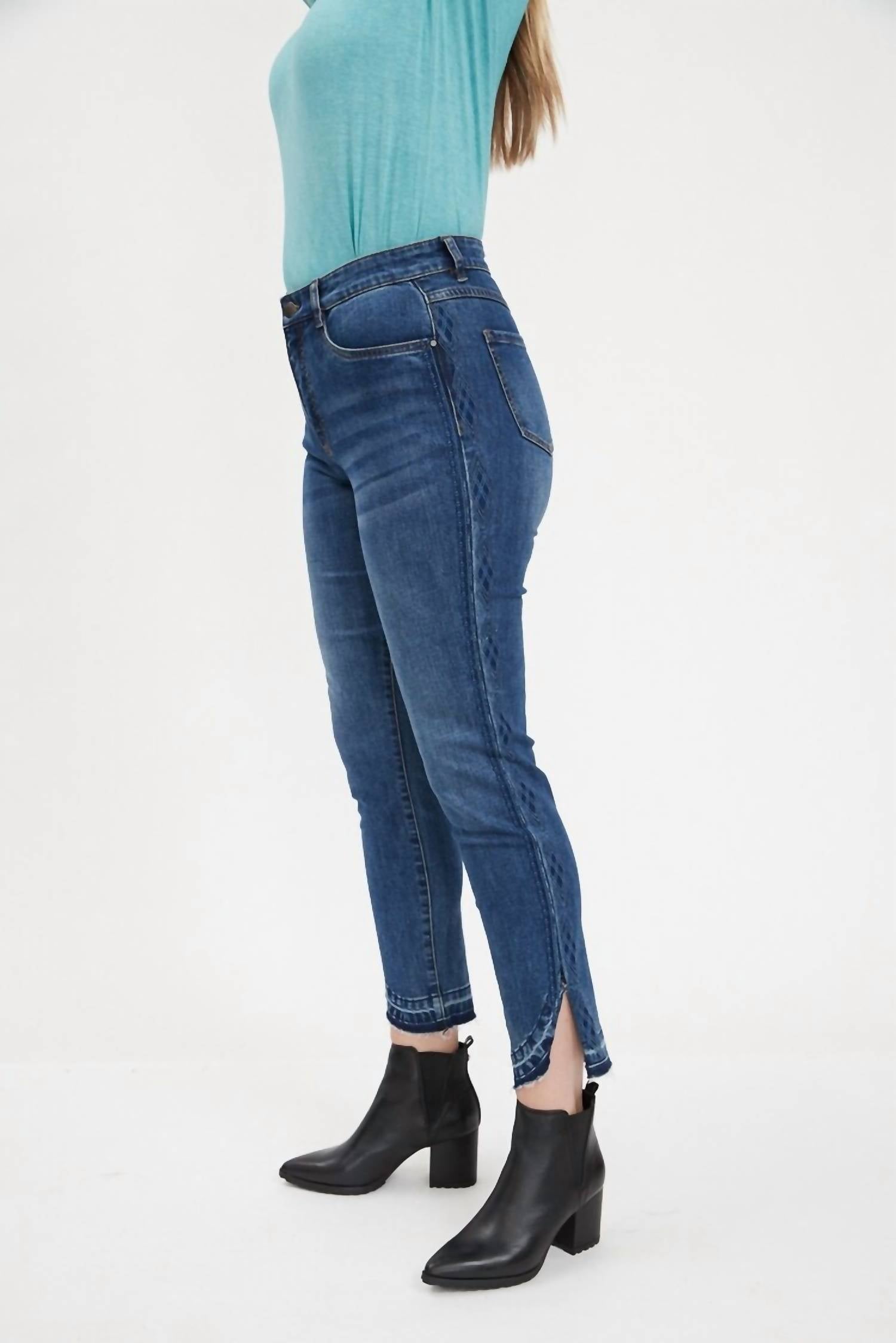Meet the FDJ Suzanne Slim Straight Ankle Jeans, a chic dark blue ensemble perfect for showcasing your fall boots. These jeans feature a unique embroidered detail along the slim straight leg, complete with a playful round hemline. Crafted from a cotton blend of 66% Cotton, 30% Polyester, 3% Viscose, and 1% Elastane, they ensure both comfort and style.