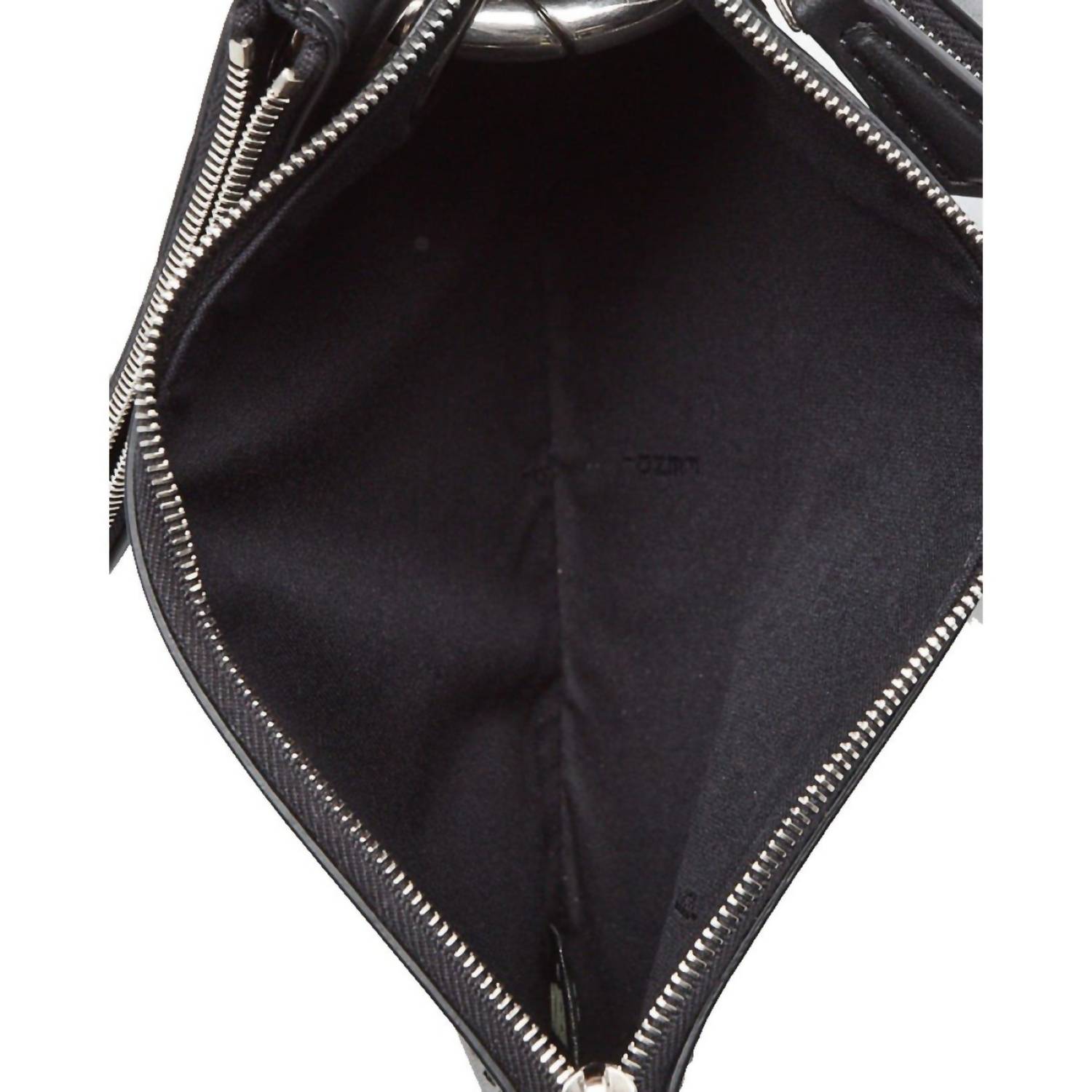 The perfect clutch for an evening out on the town. Embrace versatile elegance with the Fendi Women's Leather Pearl Studded Triplette Multi Clutch Handbag. This set features small, medium, and large pouches crafted from luxurious leather, accented with pearl studs, and made in Italy. They are secured by a silver handle with the new Fendi "F" clasp ring, allowing for seamless transition between carrying them individually or as a trio. Each pouch is lined with logo-jacquard fabric and features a top zip closure for easy access, with the large pouch measuring 9" x 0.5" x 6.5".