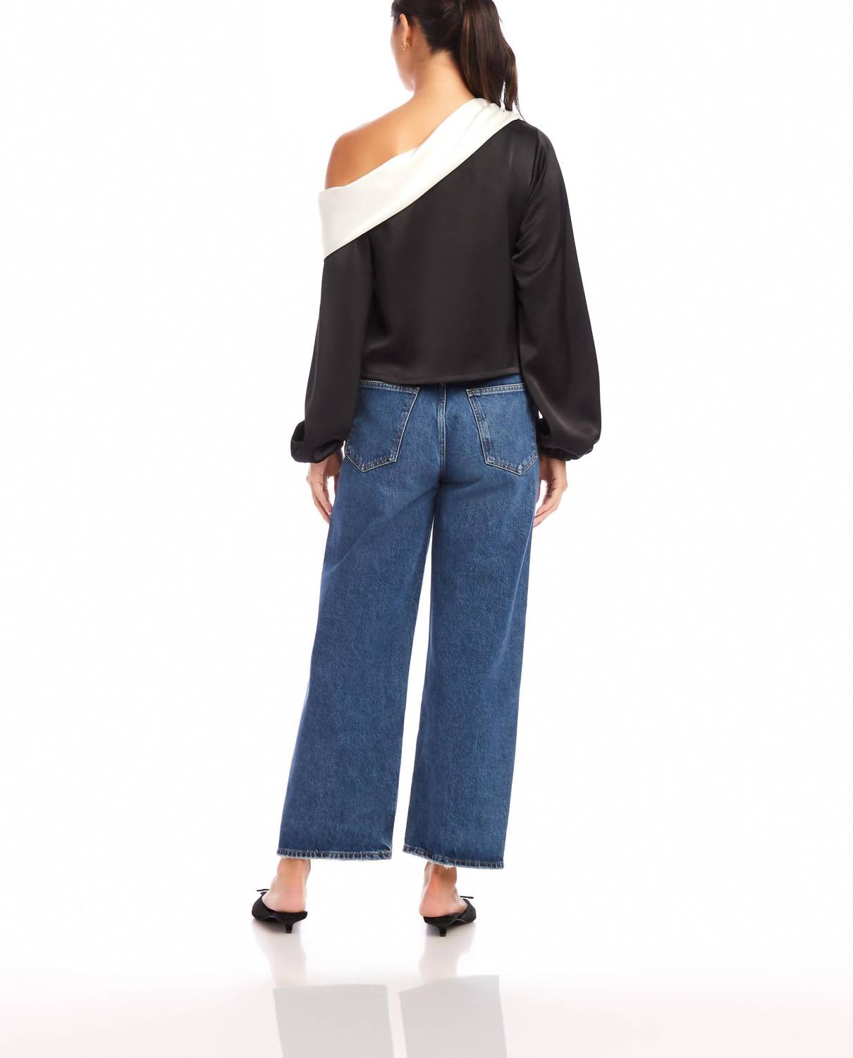 Uma blusa versátil que pode ser usada do escritório ao jantar! Eleve seu estilo para a noite com a blusa Marisa de um ombro só da Fifteen Twenty, com um design chique em blocos de cores preto e creme. Esta blusa elegante oferece mangas compridas tipo blusão com punhos elásticos e um decote de um ombro só para um toque sofisticado. Confeccionada em cetim 100% poliéster, mede 52 cm de comprimento e é orgulhosamente fabricada nos EUA com tecido importado. Projetada para ser prática, possui fecho tipo pullover e recomenda-se lavar somente a seco.