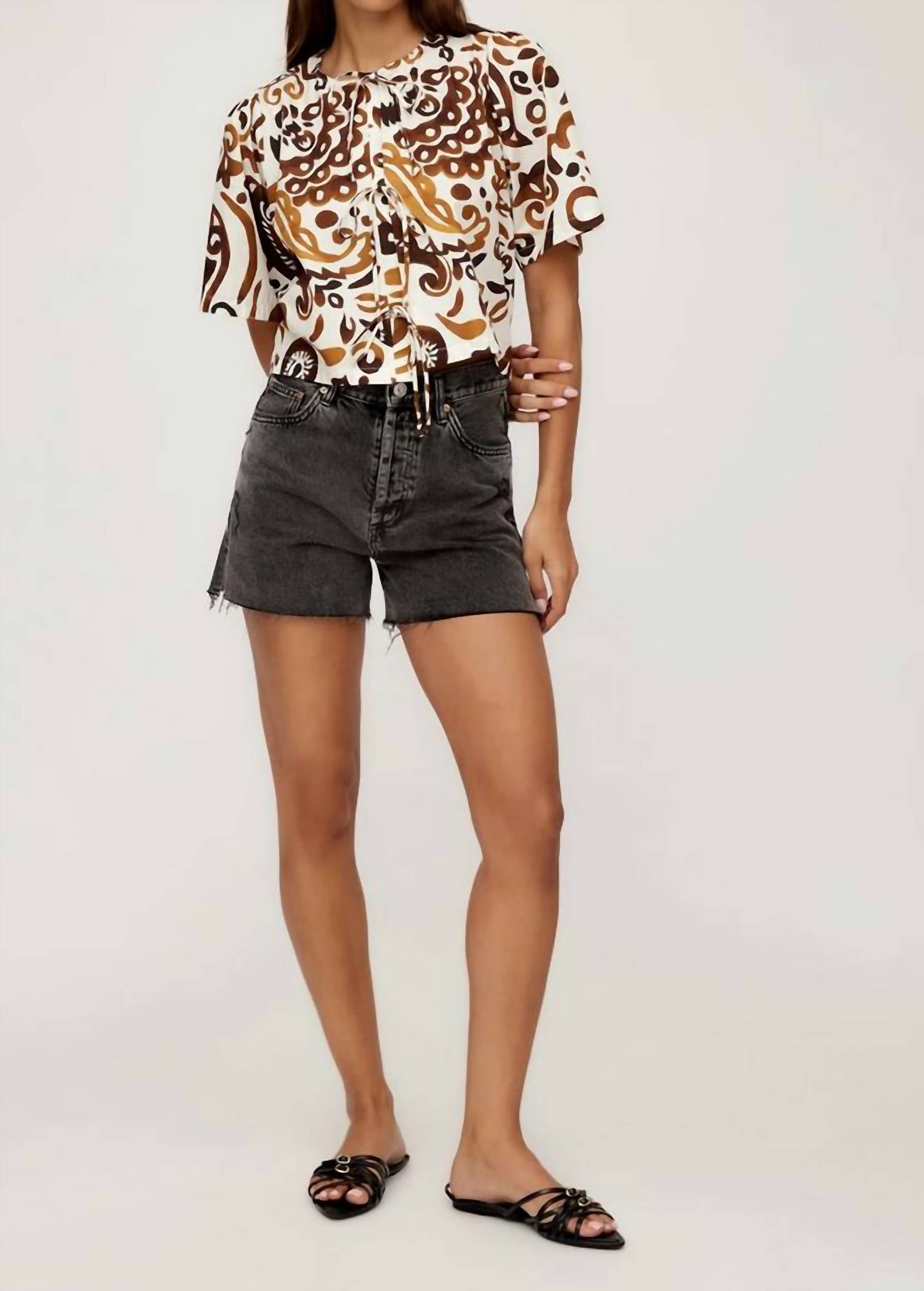 Mostre um pouco de pele com este top curto fofo e casual. O Top Semi Crop Nadine da Fifteen Twenty é uma escolha estilosa com mangas até o cotovelo e estampa batik em algodão. Confeccionado em popeline de algodão batik estampado proveniente da Itália, este top é fabricado nos EUA e apresenta um divertido fecho frontal. Seu corte semi-crop e quadrado cria uma silhueta elegante que se ajusta à cintura, tornando-o perfeito para combinar com calças de cintura alta.