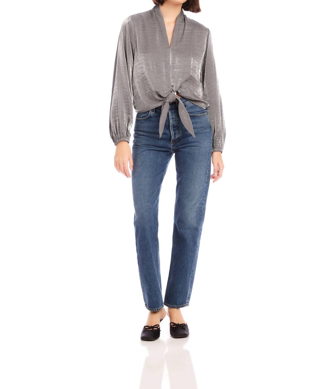 Uma blusa de manga comprida que você pode usar com jeans, saias, bem... quase tudo! O Top Scarlet Tie-Front da Fifteen Twenty é uma adição elegante e versátil ao seu guarda-roupa. Com mangas bufantes longas e decote em V, este top cinza sólido é confeccionado em 82% Viscose e 18% Nylon com brilho. Com fecho tipo pullover e um elegante detalhe de amarração frontal, mede 54 cm de comprimento (tamanho pequeno). Fabricado nos EUA com tecido importado, requer lavagem à máquina em ciclo delicado e deve ser pendurado para secar ou lavado a seco, encapsulando a essência do luxo discreto para qualquer ocasião.
