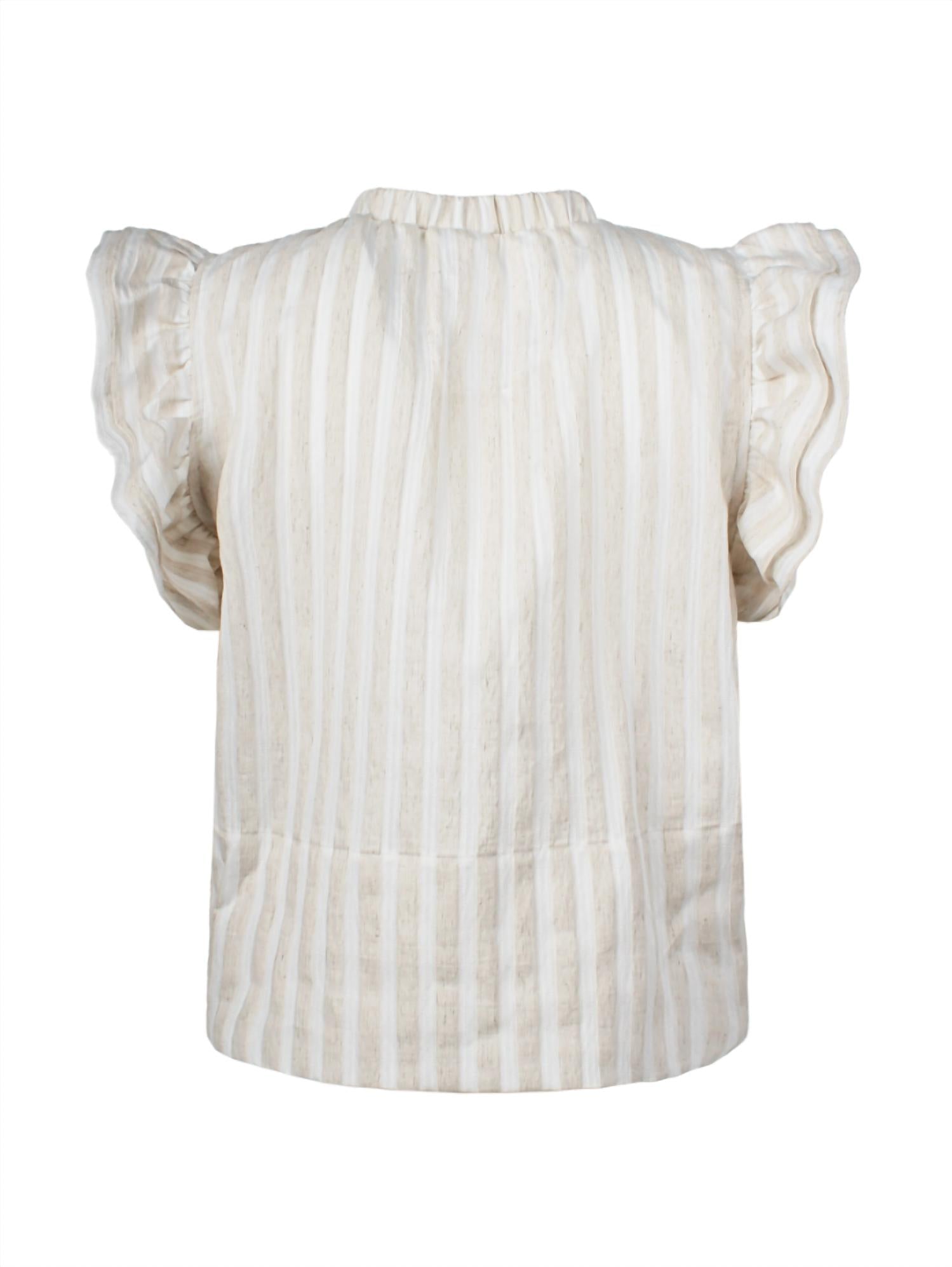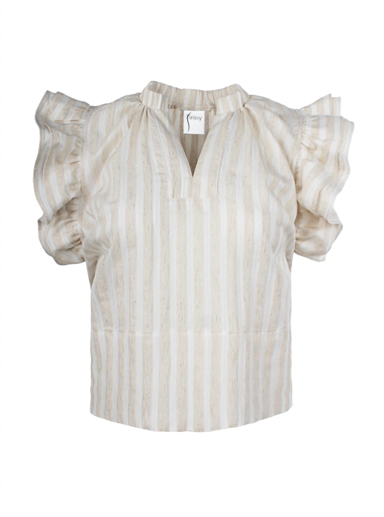 A versatile blouse that works from desk to dinner! Enhance your wardrobe with the Finley Remy Natural Stripe Top, a sophisticated piece perfect for any occasion. This blouse features short ruffle sleeves approximately 3 inches long, a V-neckline, and a boxy fit for a relaxed yet polished look. Composed of 100% viscose, this design is made in the USA and offers all-day comfort with easy styling. Care is simple with machine wash cold, and the pullover style ensures convenience and effortless charm.