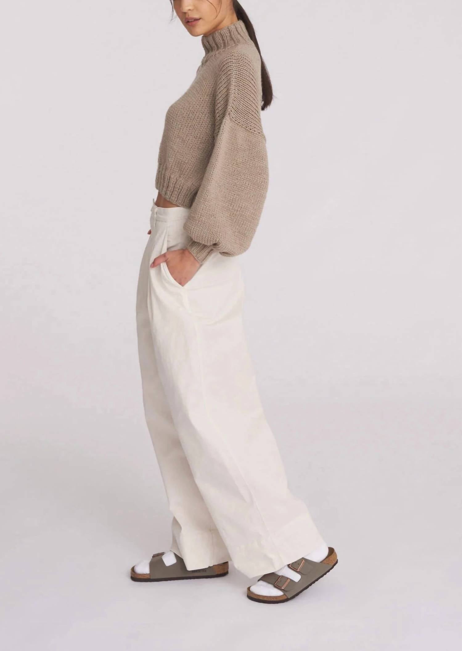The Evie Crop Sweater by First Born Knits is a women's taupe essential that seamlessly blends minimalism with comfort. It features long sleeves and a flattering cropped silhouette, enhanced by a cozy turtleneck. Made from luxury premium merino wool, this textured piece offers a pull-on closure for easy wear. Care instructions: hand wash or dry clean only.
