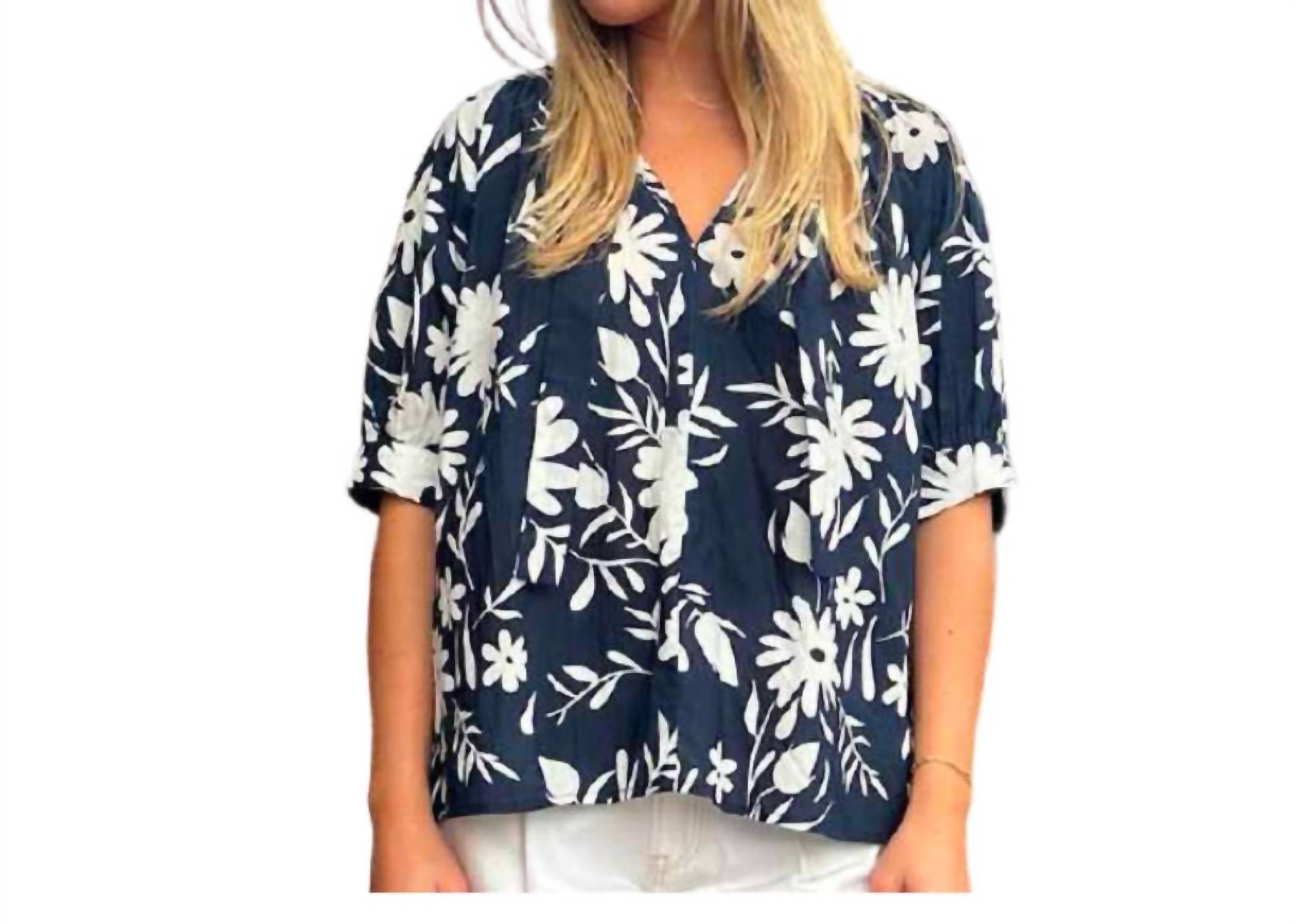 Uma blusa versátil que pode ser usada do escritório ao jantar! O Pam Top da Fitzroy & Willa oferece uma estética Boho Chic chique com seu design Mod Floral Navy. Esta blusa feminina é uma peça essencial e arejada para o verão, com mangas curtas e um decote em V elegante, ideal para férias e celebrações de Hanukkah. É confeccionada para uso sem esforço, com fecho pull-on e sem bolsos, mantendo seu visual elegante. Cuide desta peça estilosa com uma simples lavagem à mão.