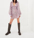 Introducing the June Mini Dress by For Love & Lemons, a stunning vacation-ready piece in vibrant purple and a warped leopard pattern. This dress features a flattering deep V-neckline, shirred waist, and gathered long sleeves complemented by an elegant flouncy skirt. Made from 56% EcoVero and 44% viscose, with a lining of 98% recycled polyester and 2% spandex, it's as sustainable as it is stylish. Closure is with an invisible zip, and care is advised through dry cleaning only.