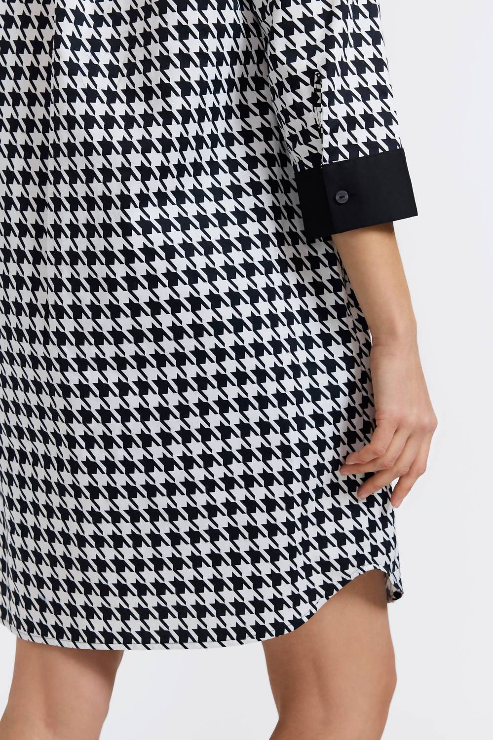 Comfortable and cute, this casual day dress has it all. Upgrade your wardrobe with the Women's Sloane Classic Houndstooth Dress by Foxcroft, a staple for any fashion-forward individual. This dress features three-quarter sleeves with button cuffs and a notched collar, highlighted by a striking houndstooth print with contrasting black trim. Designed with a regular fit, on-seam pockets, and an exposed half placket for convenient styling, it offers a 37½" center back length in size S. Enjoy the sophisticated appeal of its slightly heavier cotton fabric, providing both a flattering drape and all-day comfort.