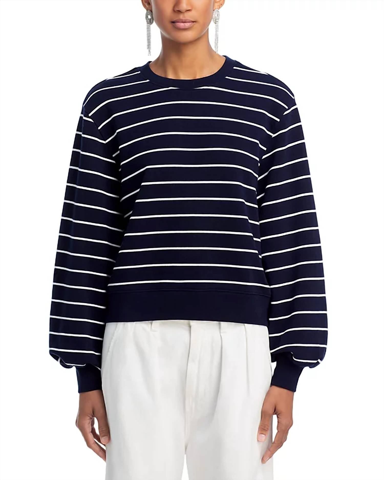 Introducing the Blouson Sleeve Sweatshirt by FRAME, a chic addition to your fall wardrobe with its sophisticated navy multi-stripe design. This relaxed-fit sweatshirt features long blouson sleeves and a cozy crewneck, all beautifully accented with banded trim. Crafted from 100% cotton, this piece offers both comfort and style. Closure: Pull on. Care: Machine wash, lay flat to dry. Approximate Length: 21.75 inches, based on a size small.