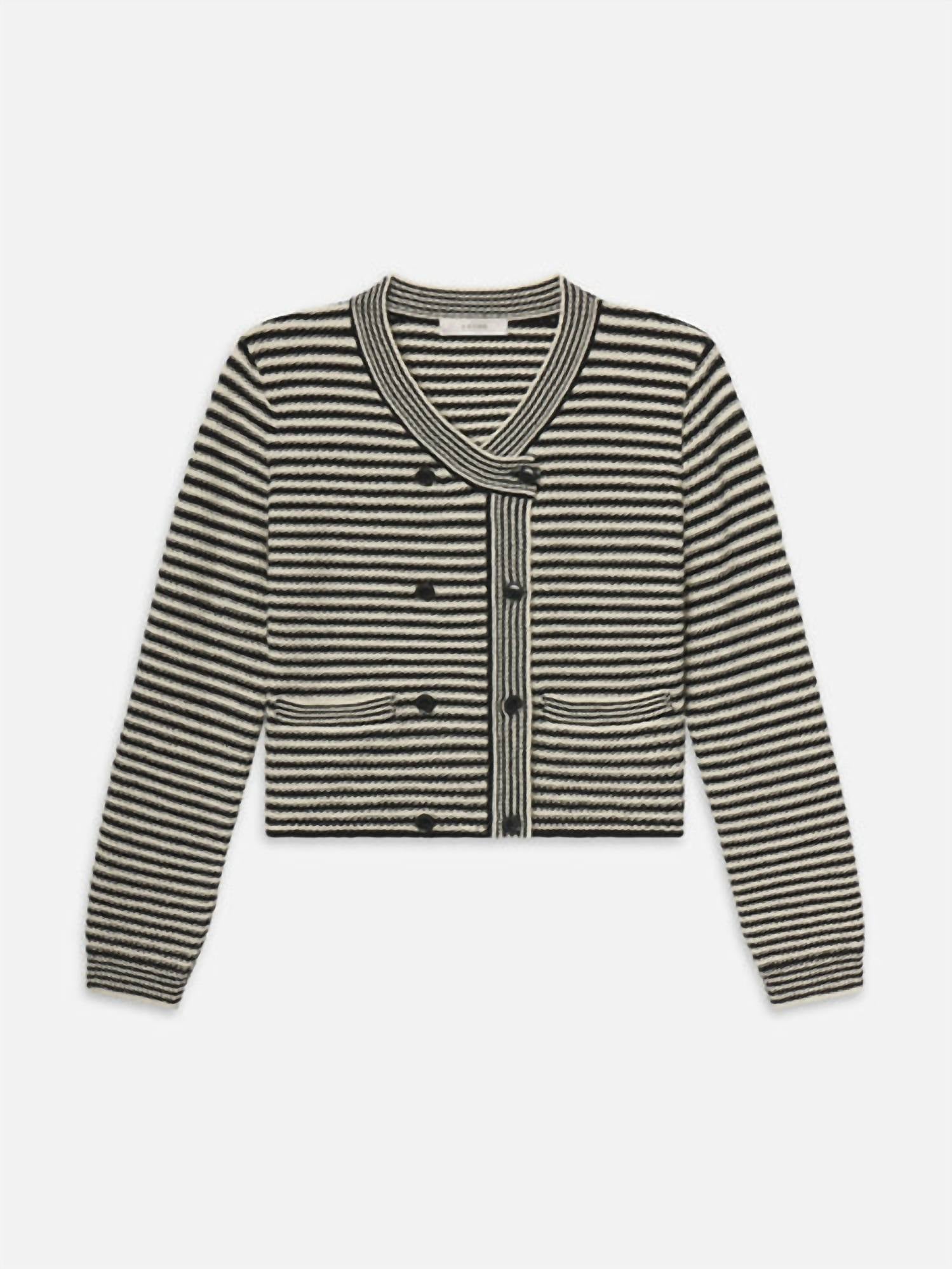 The Court Cardi by FRAME is a sophisticated fusion of double-breasted coat design and cardigan comfort in a striking black multi-stripe pattern. Crafted from a 75% cotton and 25% polyamide blend, this stylish long sleeve piece is made in Bulgaria and features a feminine V neckline and waist pockets with contrast stripe trim. The cardigan's distinctive front showcases double-breasted button closure and sewing front pockets for added functionality. Care for this chic piece with dry cleaning only.