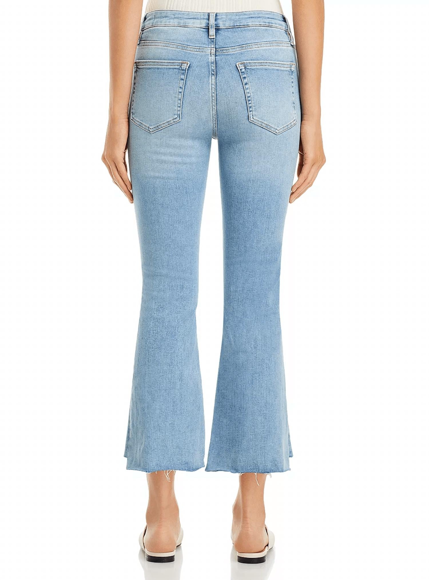 Meet the Le Crop Mini Boot Step Fray Jean by FRAME, a chic addition to your spring wardrobe designed for minimalists. These Colorado-colored, light wash denim jeans offer a mid-rise fit with a high-rise of 9.75 inches and a cropped inseam of 26.5 inches. Featuring a wide-leg style, the mini bootcut silhouette is enhanced by contrast stitching, copper-tone hardware, and a 5-pocket design. Closure comes with a zip and button, and for care, machine wash and tumble dry. Model is wearing size 27 with measurements: 5'10" height, 33.5" bust, 23.5" waist, 34.5" hips.