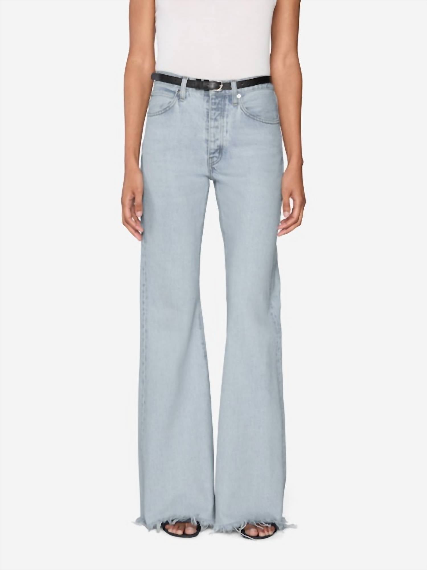 A flattering silhouette that's suprisingly versatile. Introducing the Women's The Lax Flare Pants by FRAME, a stylish choice in a Wisp Raw Fray shade perfect for your spring wardrobe. These pants feature a flared leg design with solid patterning, ideal for vacation and streetwear trends. Closure: Zip Closure. The light wash denim is perfect for a relaxed look, but the care instructions are not specified.