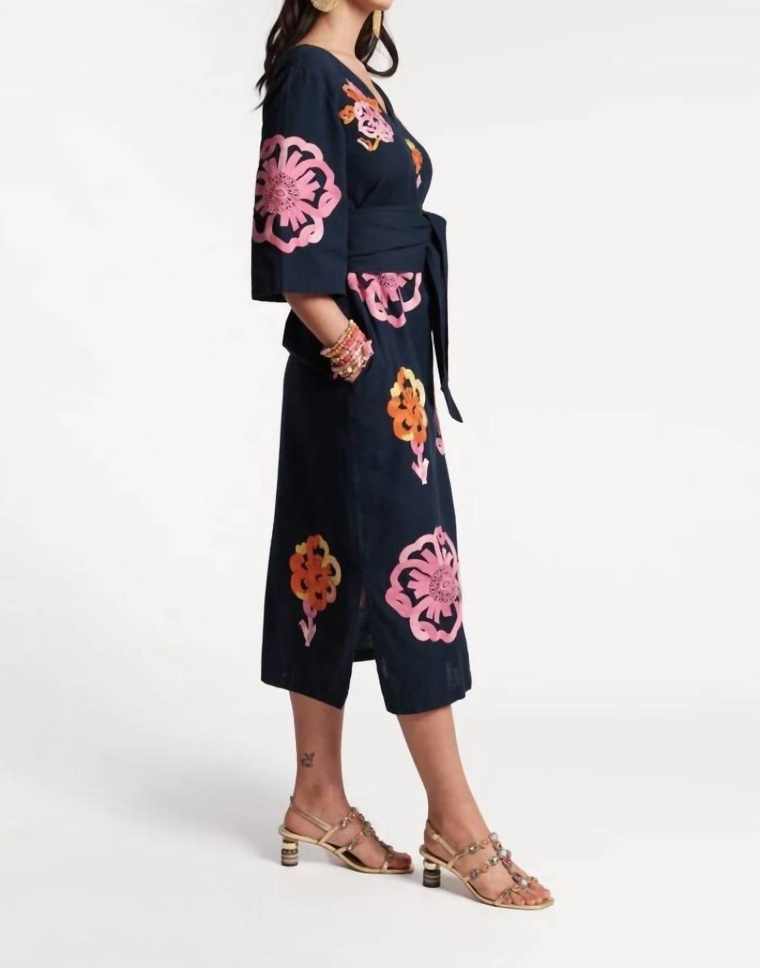 Um vestido midi tão versátil que suas opções de uso são infinitas. O Vestido Emi é um vestido longo estilo Obi com lindos detalhes bordados e uma estampa gráfica de Gerbera Rosa-Marinho. Possui mangas até o cotovelo, fendas laterais, decote em V espelhado e cinto faixa removível com amarração nas costas. Feito de uma mistura macia e respirável de algodão e linho, ele também inclui dois bolsos. Fabricado na Índia.