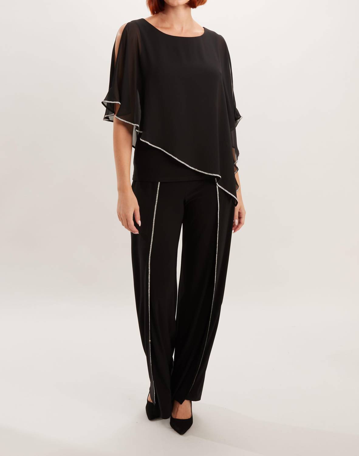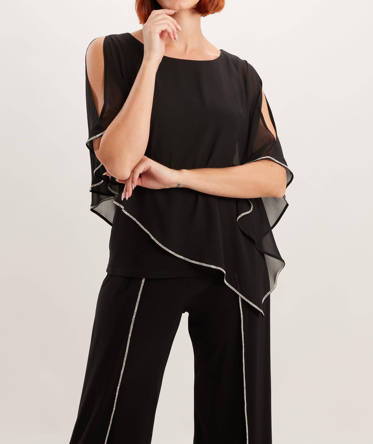 Combine isso com seus jeans e chinelos favoritos para sua próxima noite entre amigas. Adicione um toque de elegância ao seu look noturno com o Blusa Pulôver Frank Lyman Chic Embellished na cor preta clássica. Esta blusa feminina possui mangas curtas e uma elegante gola redonda, com uma sofisticada sobreposição de chiffon em camadas para um toque especial. Confeccionada em 95% poliéster e 5% elastano, esta blusa oferece um fecho confortável, perfeito para uma saída à noite ou um evento. Com seu padrão sólido, é a escolha ideal para ocasiões de primavera.