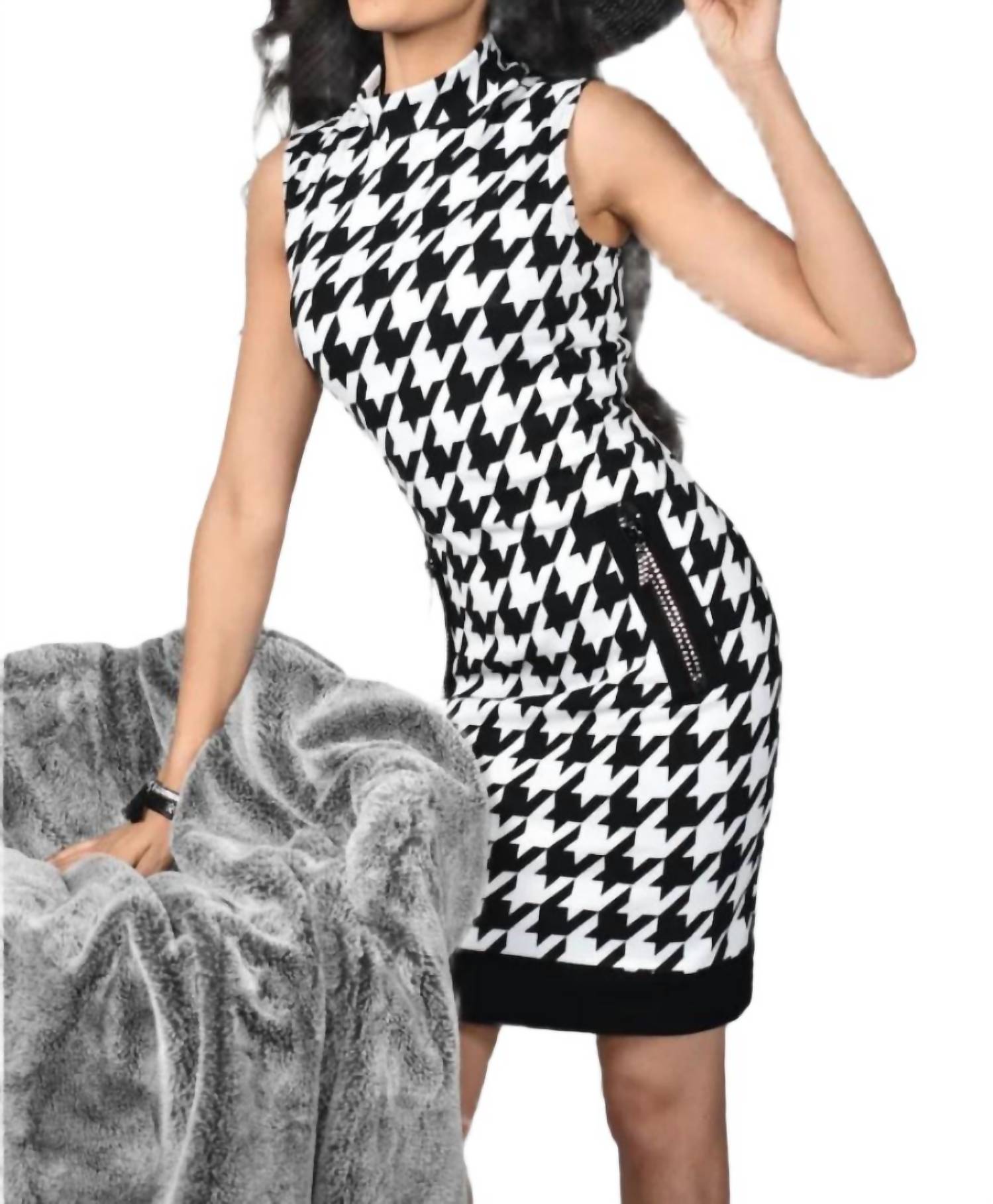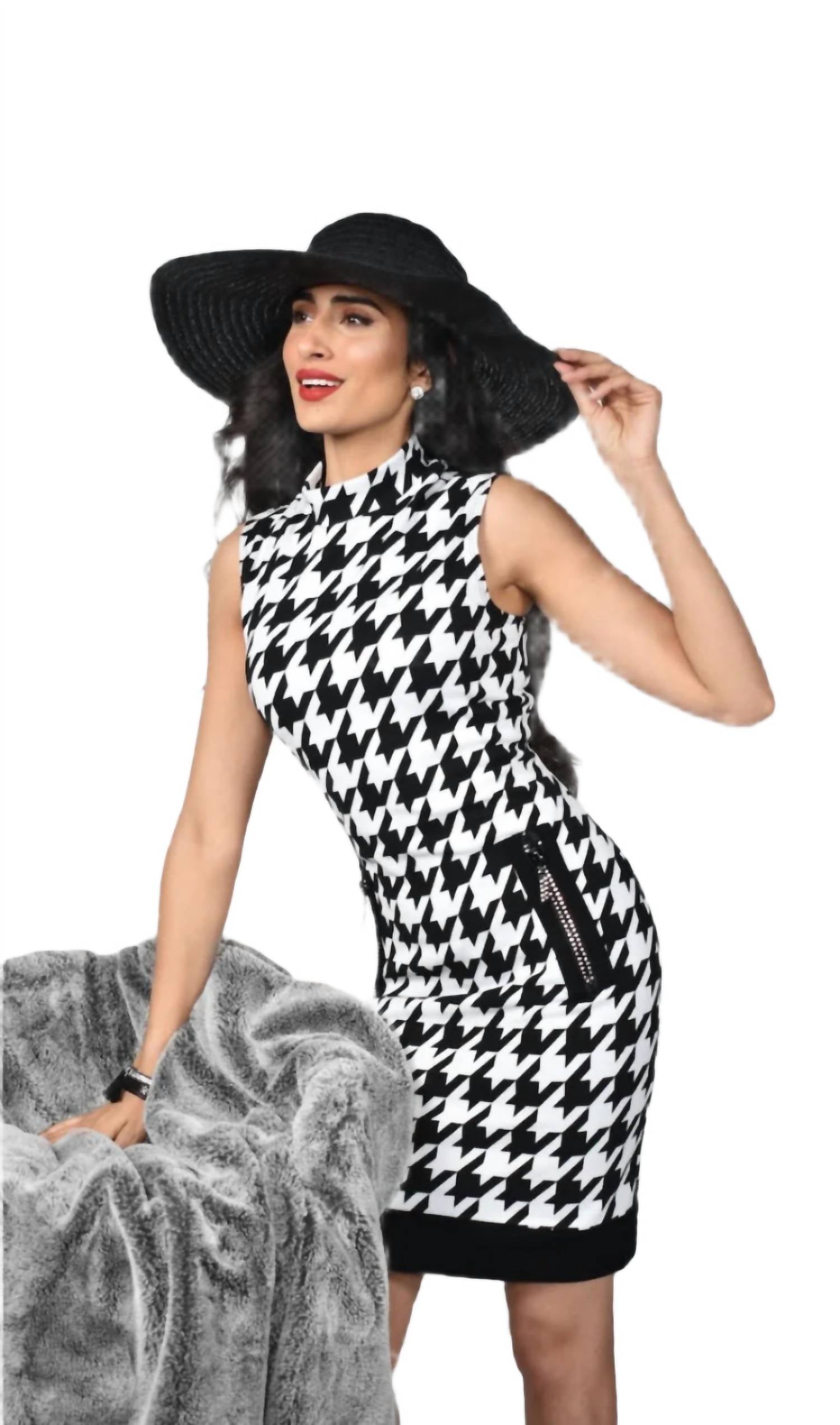 Entre na sofisticação chique com o Mini Vestido com Estampa Pied-de-poule da Frank Lyman, perfeito para qualquer jantar. Este vestido curto feminino apresenta uma estampa ousada em preto e branco, gola alta e design sem mangas, tornando-o ideal para ocasiões de primavera. Confeccionado em 93% poliéster e 7% elastano, ele atinge acima do joelho e inclui deslumbrantes bolsos falsos com zíper e cristais para um toque de estilo. Fechamento: Puxe para vestir.