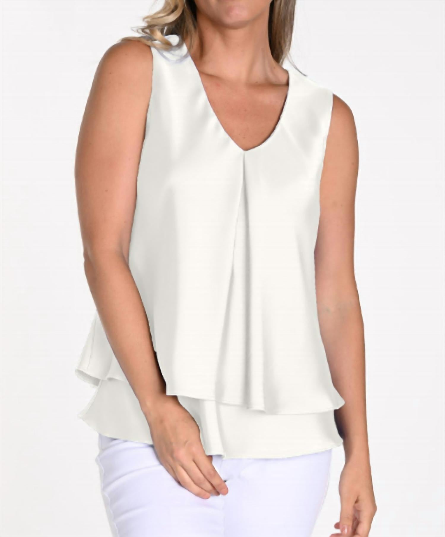 Combine isso com seus jeans e chinelos favoritos para sua próxima noite entre amigas. Experimente a elegância com a Blusa Frank Lyman em Camadas de Cetim Sem Mangas em um tom marfim atemporal. Confeccionada em uma mistura leve de cetim, esta blusa apresenta um elegante decote em V e uma bainha em camadas chamativa. Seu design sem mangas a torna perfeita para usar com sobreposições ou sozinha. Composição: 100% poliéster, oferecendo estilo e conforto.
