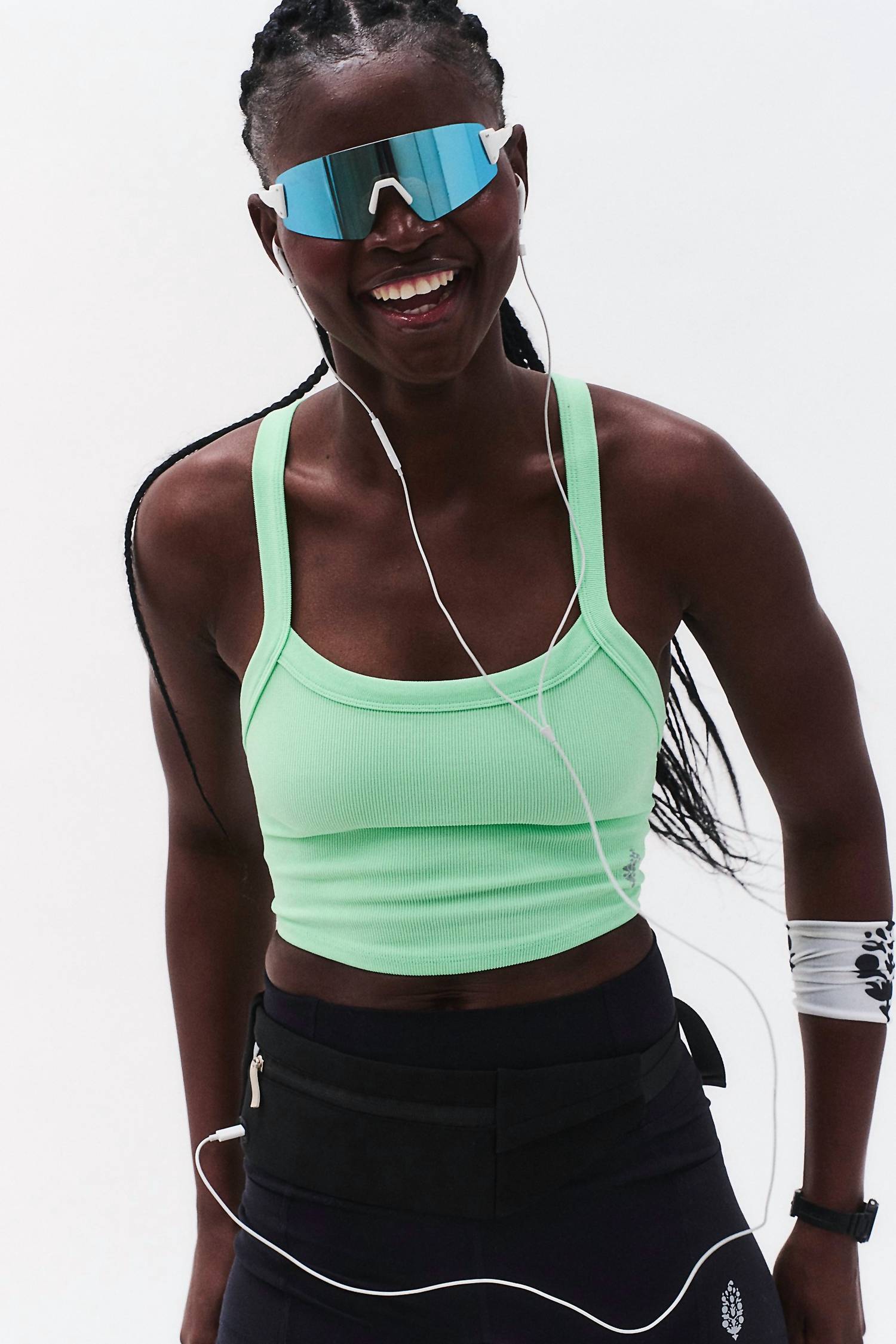 Introducing the All Clear Solid Cami by Free People in vibrant Bright Jade. With spaghetti straps, this crop top is crafted from soft Polyamide for a barely-there feel, featuring a flattering scoop neckline and racerback design. This women's activewear essential has a cropped silhouette with a body length of 10.5 inches, perfect for summer athleisure looks. Closure: Pull on. Care: Machine wash cold. Measurements for size small: Bust 22 inches.