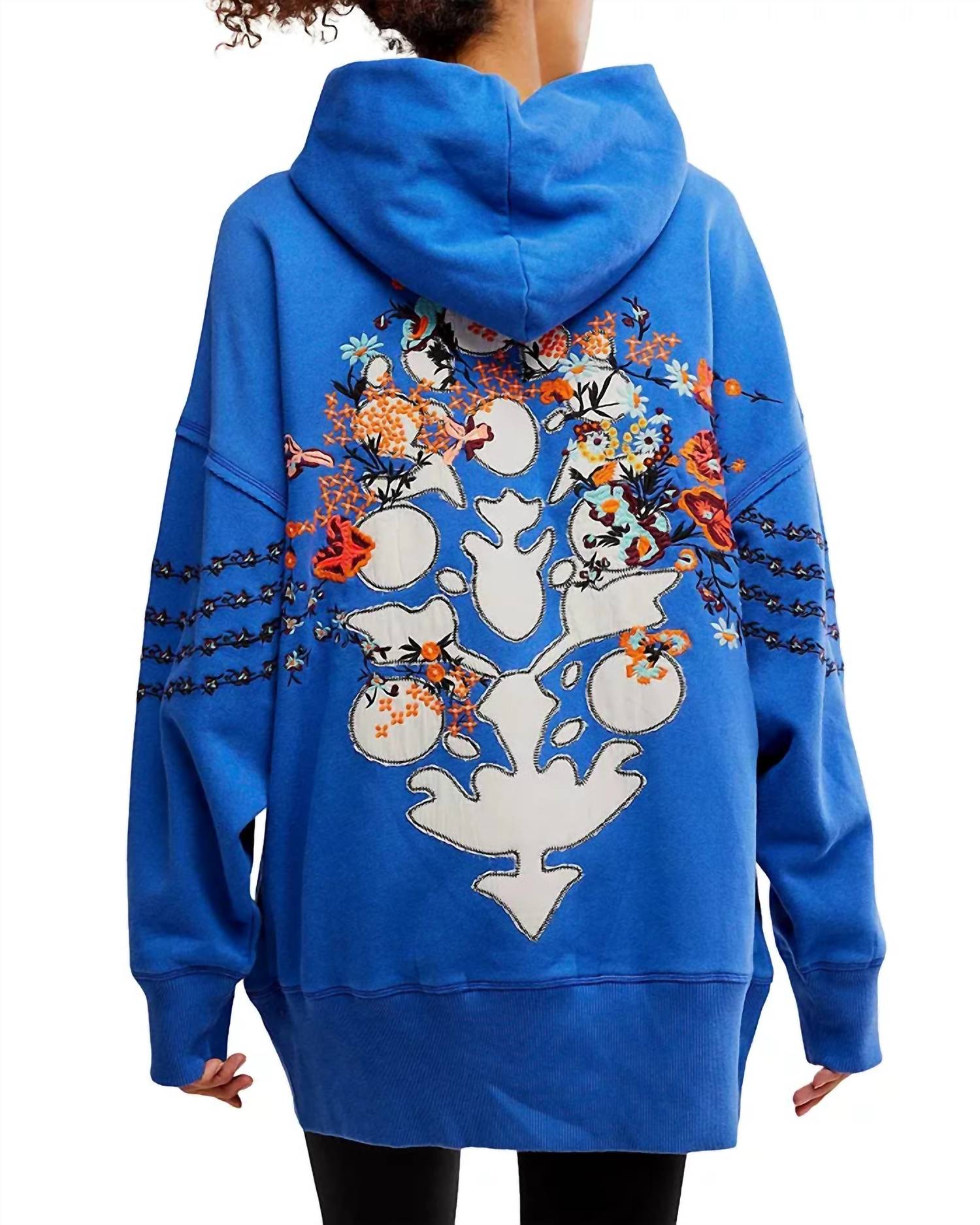 Stay stylish on your travels with the At My Best Embroidered Hoodie by Free People, crafted in a striking Stellar Blue. Designed with long sleeves, this women's hoodie features a convenient pull-on closure and a graphic pattern, adding an artistic touch to your winter wardrobe. Equipped with pockets and a classic hooded neckline, it seamlessly blends practicality with fashion. Care instructions are not provided, so please handle with care.