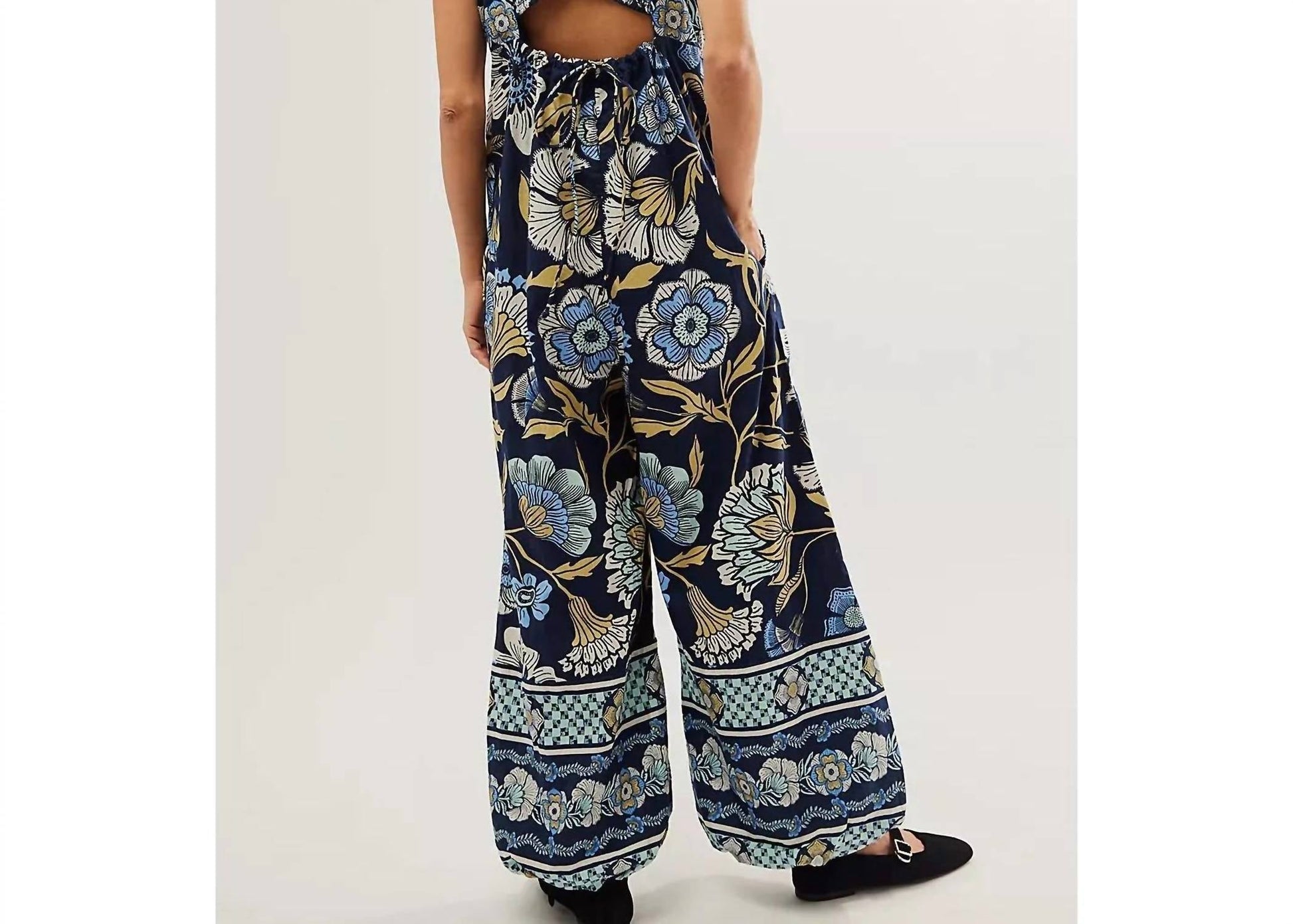 Slim at the bodice with billowy balloon leg silhouette. Square neckline, ruffled straps, back cutout detail, banded hemlines, mixed vintage-inspired paisley print. Rise: 19". Inseam: 25.75". Machine Wash Cold. 100% Cotton.