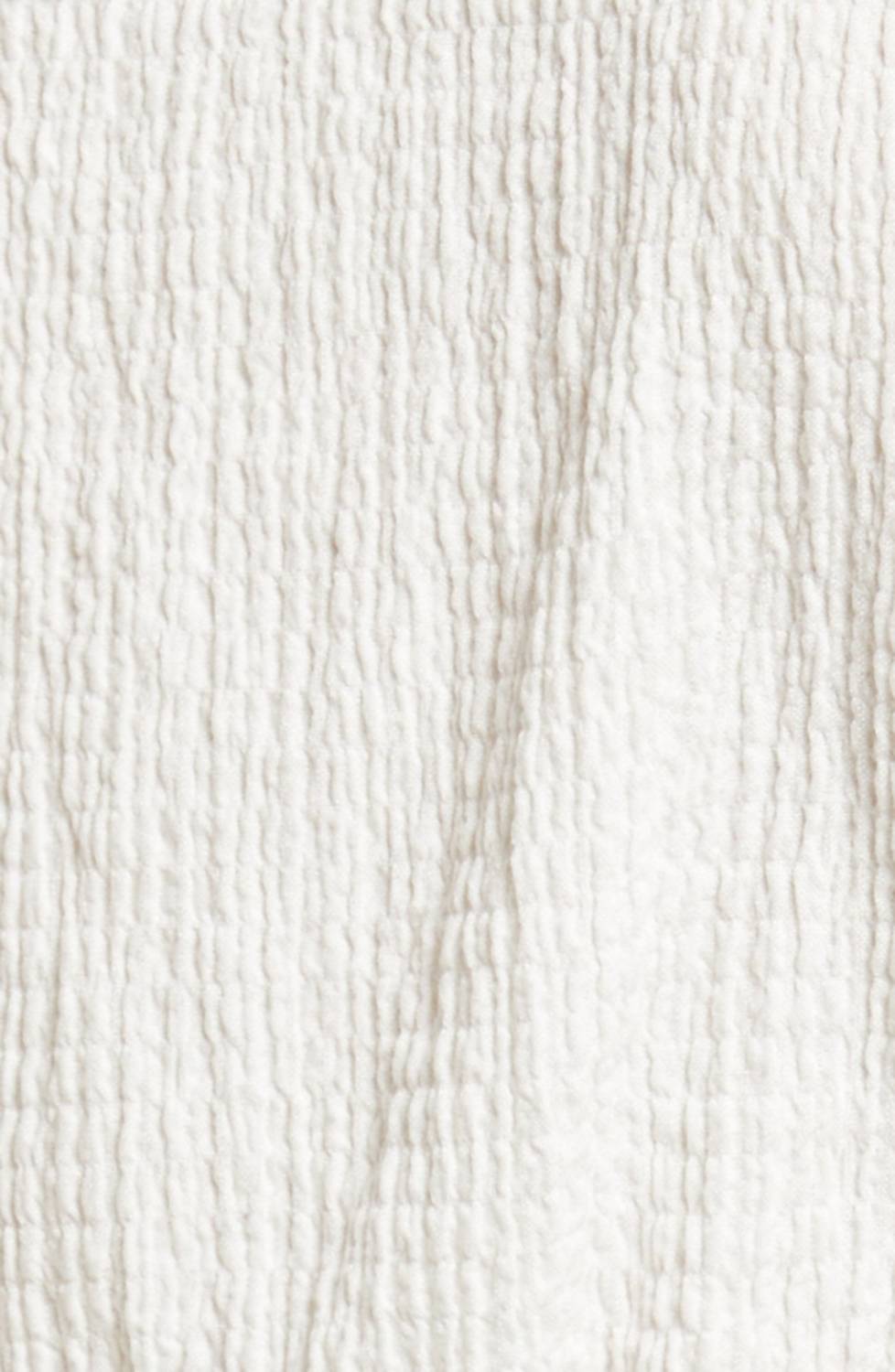Elevate your wardrobe with the Billie Sweater Top by Free People, a chic V-neck in elegant ivory. Designed with three-quarter pointelle-knit sleeves and a textured pattern, this top effortlessly combines style and comfort. The garment features a wide smocked hem for a flattering fit and is crafted from 50% viscose, 48% polyester, 2% elastane with contrast materials. Closure: Pull-on. Care: Machine wash.
