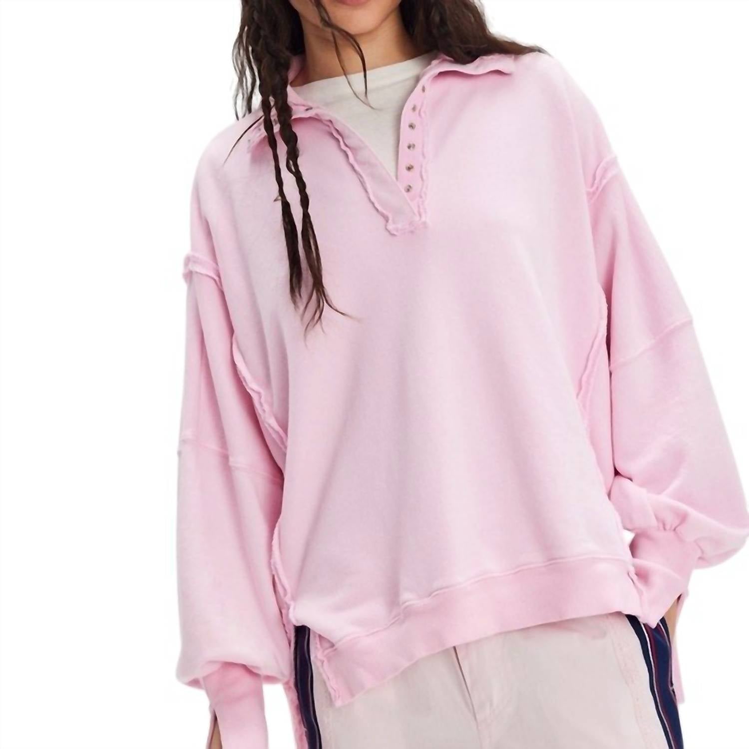 Embrace comfort with the Camden Henley Sweatshirt by Free People, a staple piece from the We The Free collection in a chic Sweet Lilac hue. Designed with long drop-shoulder sleeves and a slouchy, oversized fit, this sweatshirt features a collared neckline with convenient snap-button closures. The garment has a soft cotton blend composition of 51% cotton and 49% polyester and measures a 67-inch bust and 28.5-inch length in size small. Easy to care for, this imported piece is perfect for layering and should be machine washed cold.