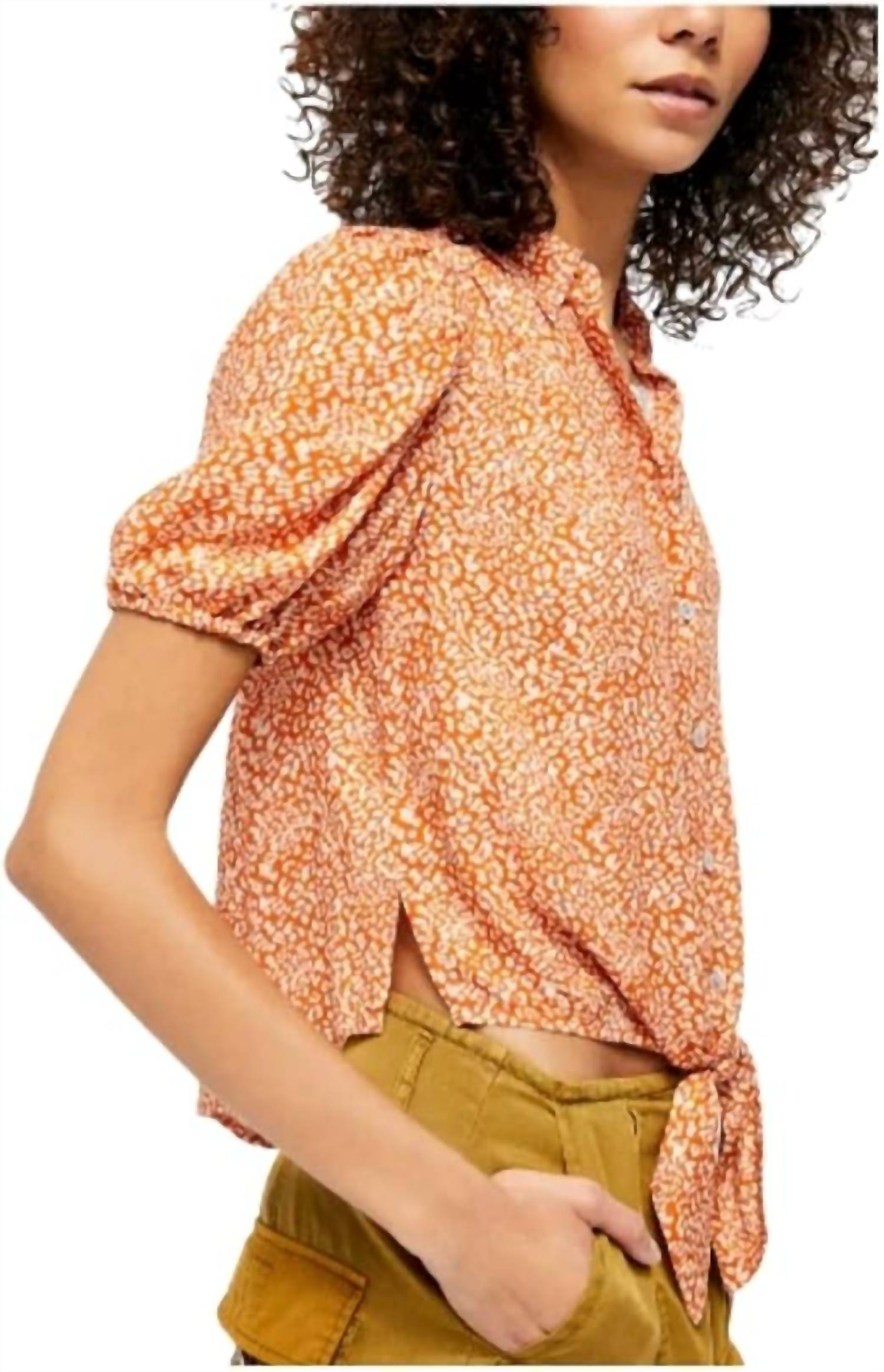 Printed Celia blouse with a tie front silhouette and puff sleeve. Back pleating. Point collar. Front button closure. Short puff sleeve. 100% Viscose.