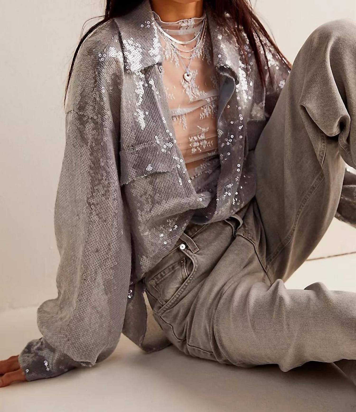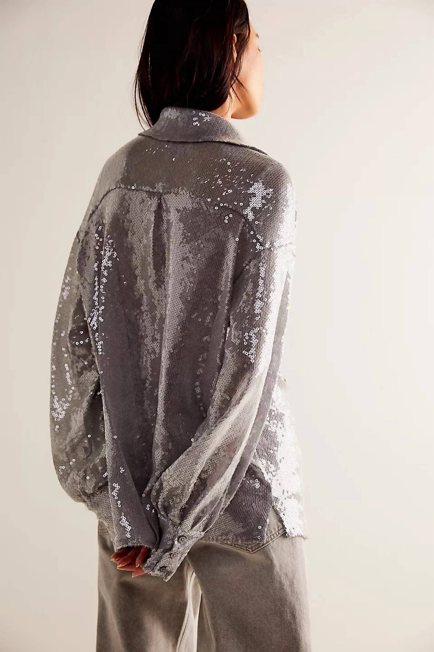Uma camisa clássica de botões que nunca sai de moda. Esta camisa adornada com lantejoulas apresenta um corte folgado e oversized com uma silhueta clássica. Possui gola descolada, bolsos no peito e mangas caídas com punhos. Confeccionada em 95% poliéster e 5% elastano, tem 73 cm de comprimento (tamanho pequeno). Lavar à mão com água fria. Importado.
