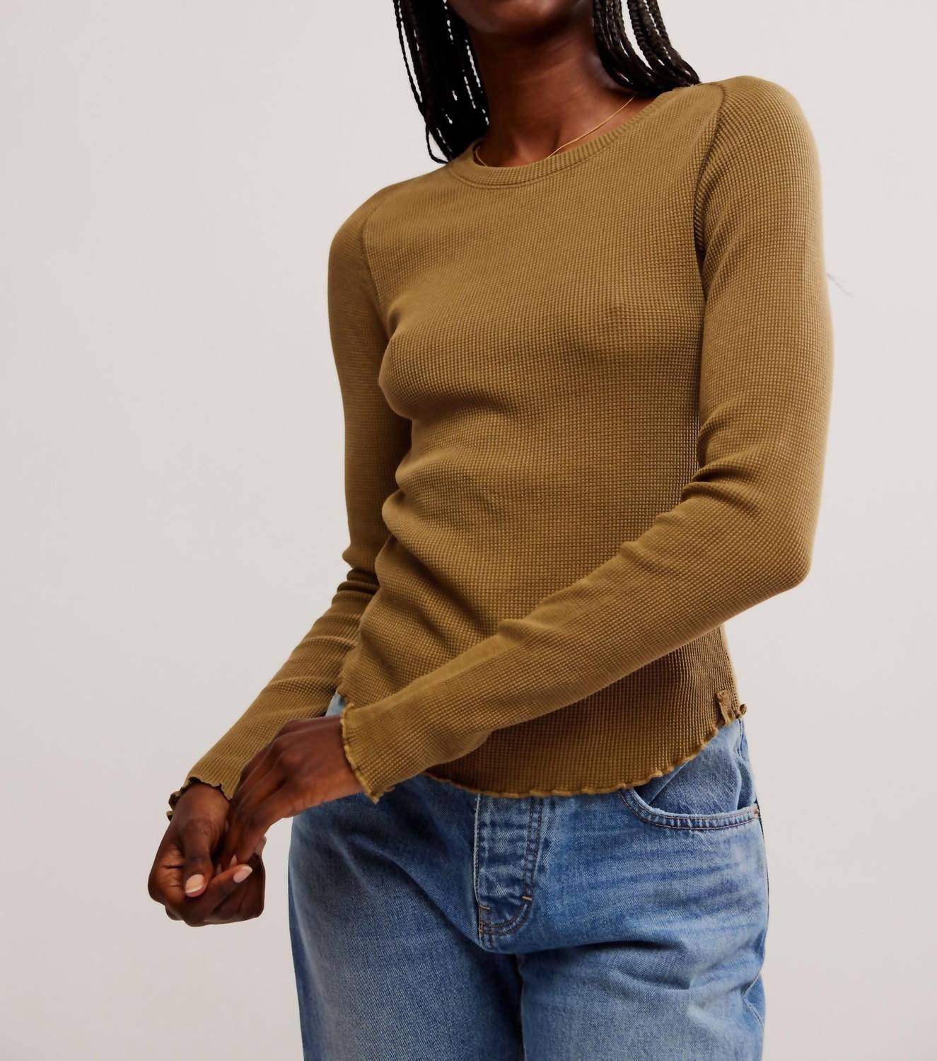 Uma blusa de manga comprida que você pode usar com jeans, saias, bem... quase tudo! Apresentamos a blusa de manga comprida Easy Does It da Free People, uma peça essencial no guarda-roupa em tom oliva militar. Confeccionada com mangas compridas, esta camiseta apresenta um tecido macio em malha waffle, oferecendo um caimento justo e relaxado na altura do quadril. Confeccionada em uma mistura de algodão resistente (95% algodão, 5% elastano), apresenta gola careca e mangas raglan com acabamento elegante em alface. Origem: Importado, com fecho pull-on. Cuidados: Lavar à máquina com água fria. A modelo veste tamanho pequeno (Busto 71, Manga 72,5, Comprimento 59,5 cm).