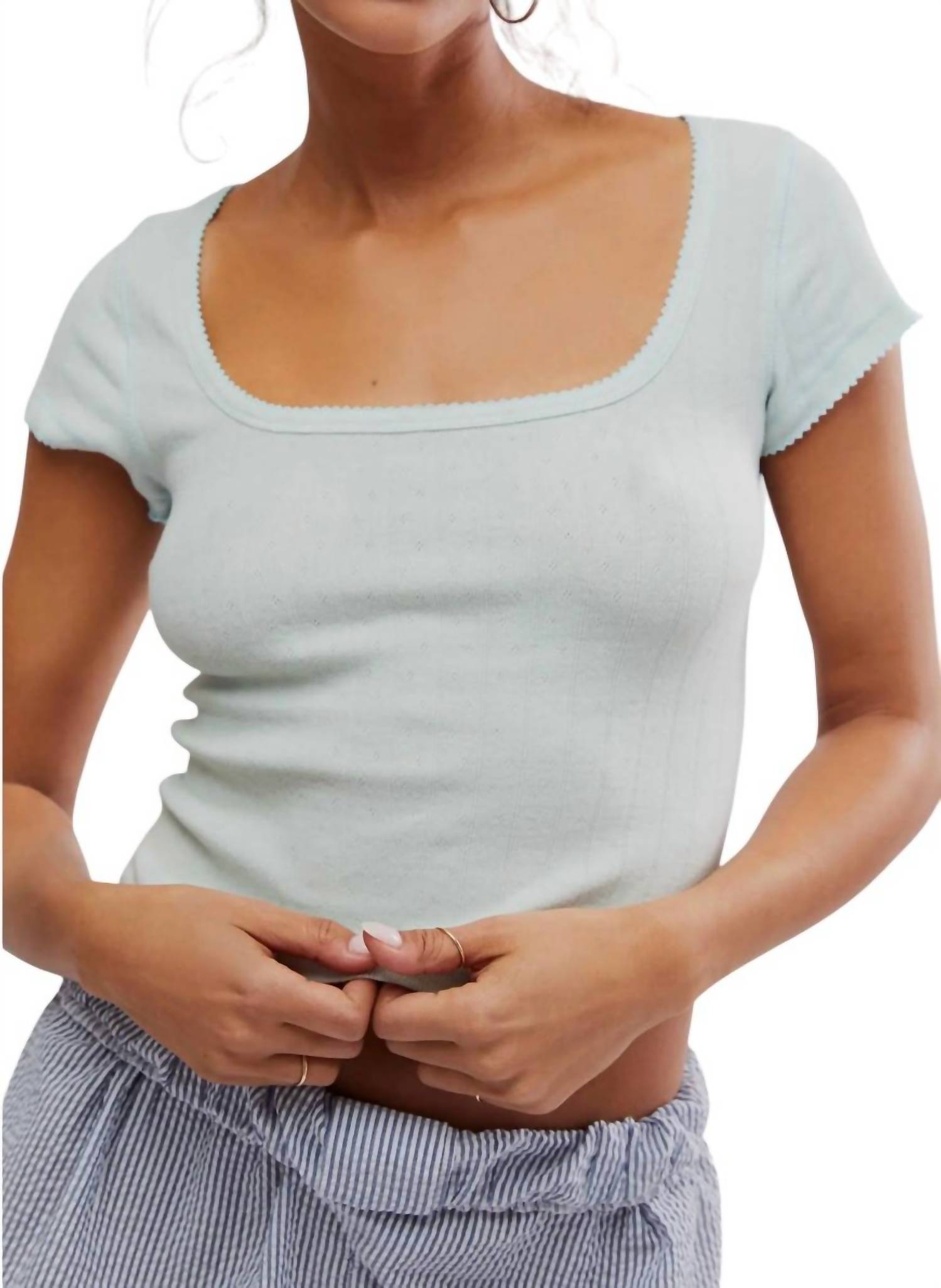 This End Game Pointelle Baby Tee is a lightweight, cropped cap-sleeve top with a wide scoop neckline and delicate pointelle detail, made from a soft 95% Cotton, 5% Elastane blend. Perfect for pairing with your favorite bottoms.